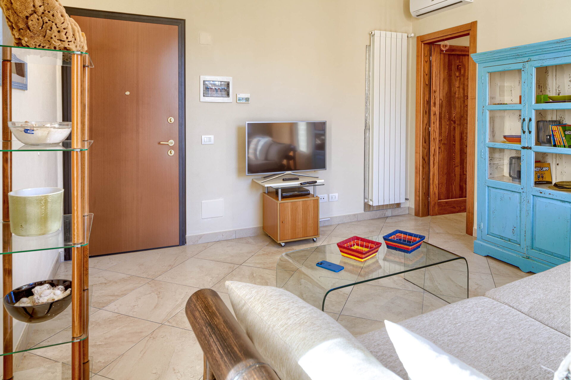 Living room with sofa, coffee table, mirror, access to a small balcony, TV.
