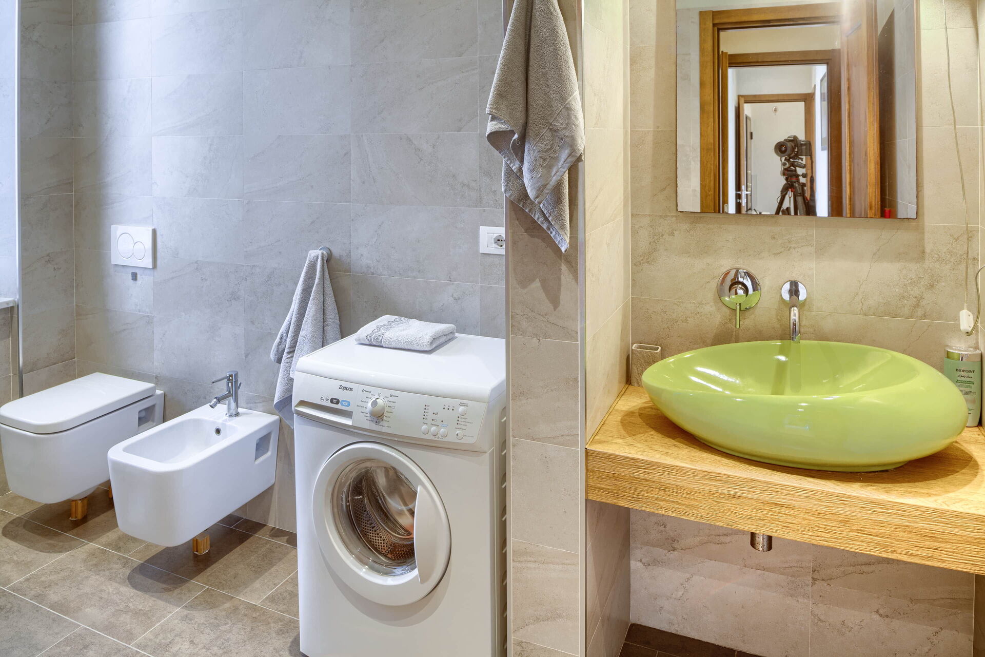 A bathroom with large shower box, sink, toilet, bidet; washing machine.