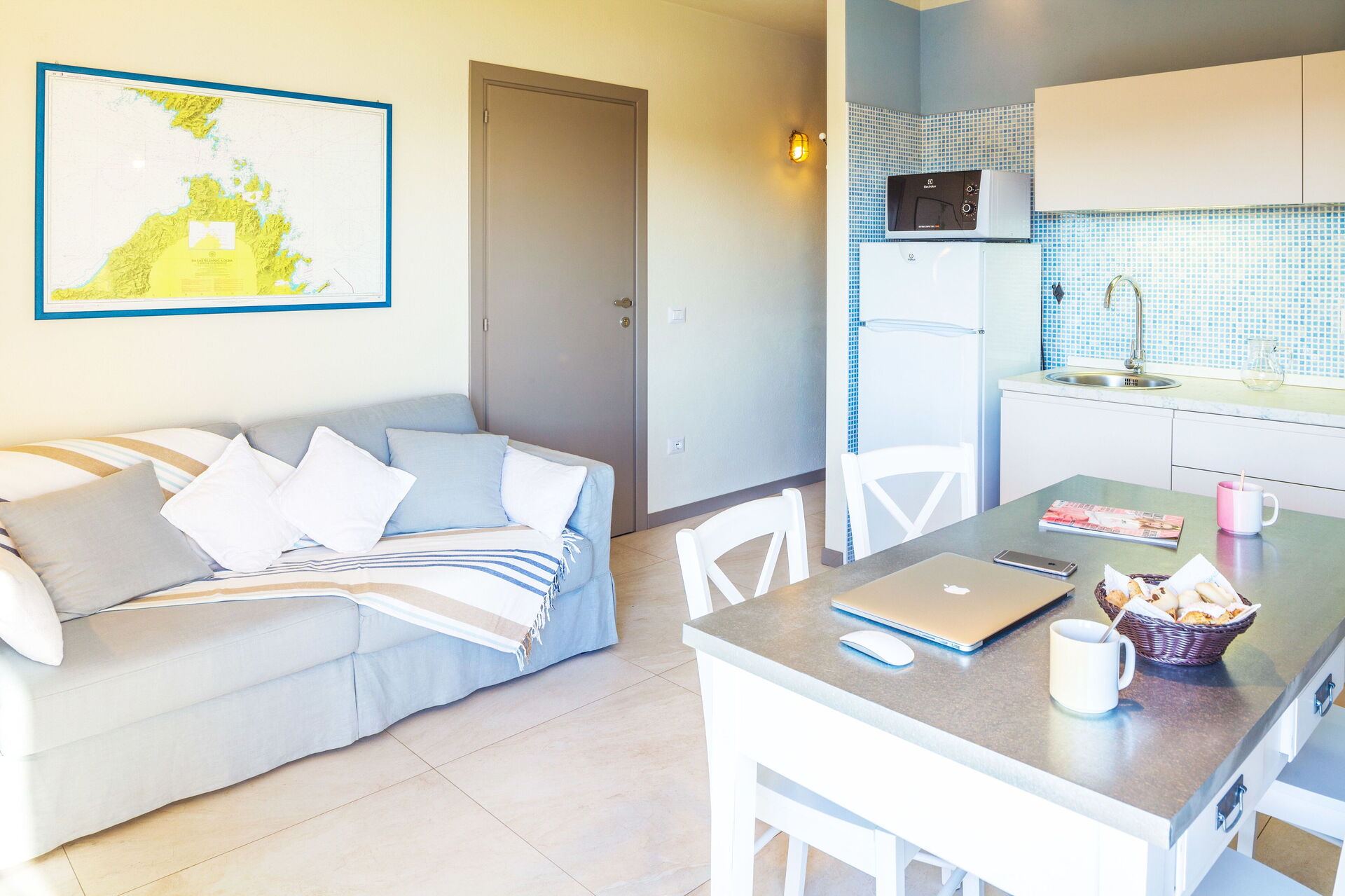 Living room and a fully equipped kitchen, directly facing the sea-view terrace.