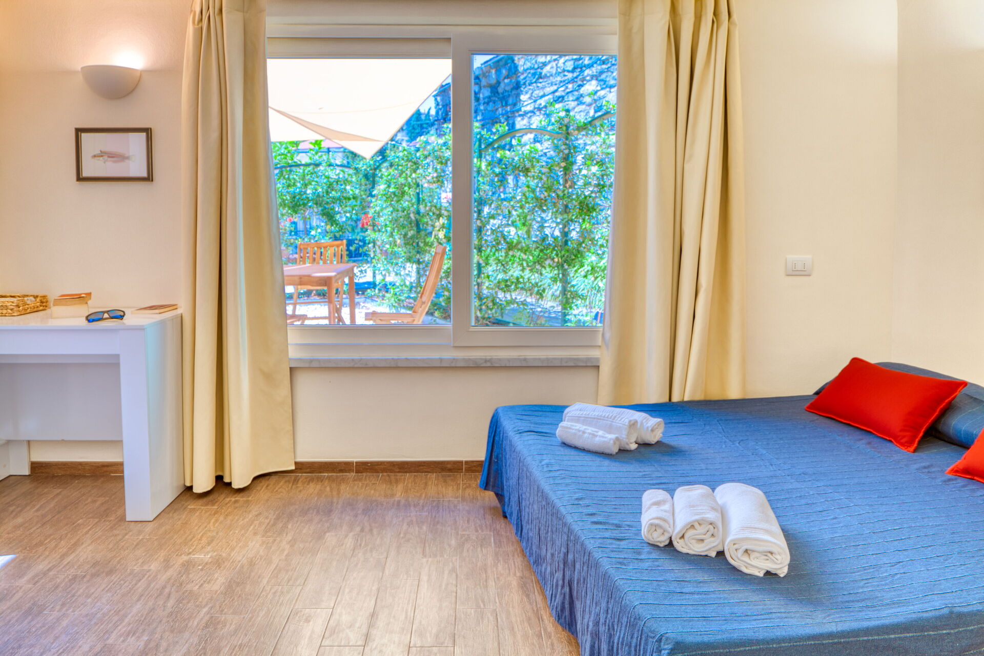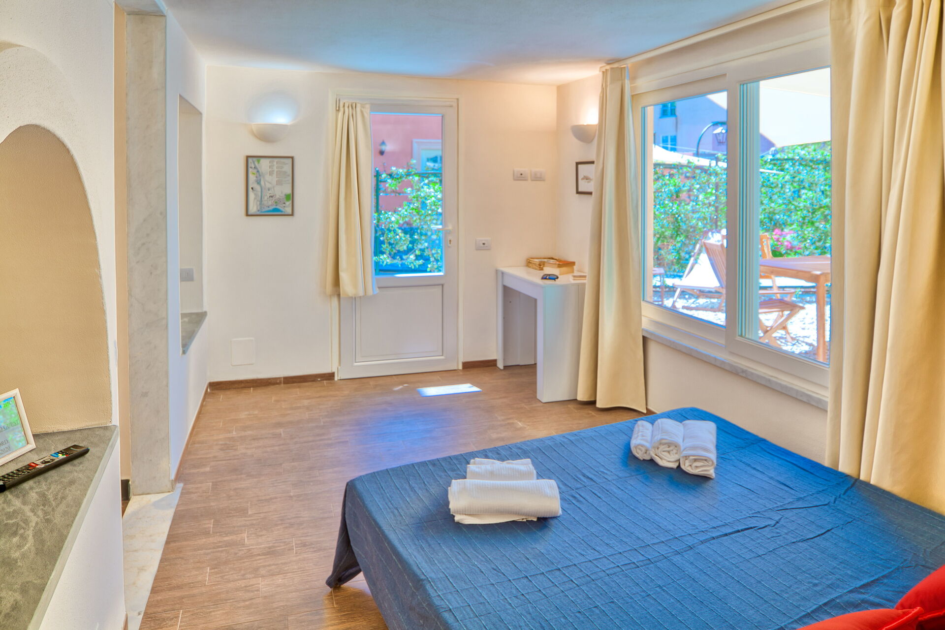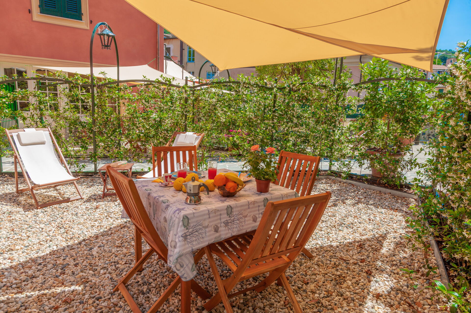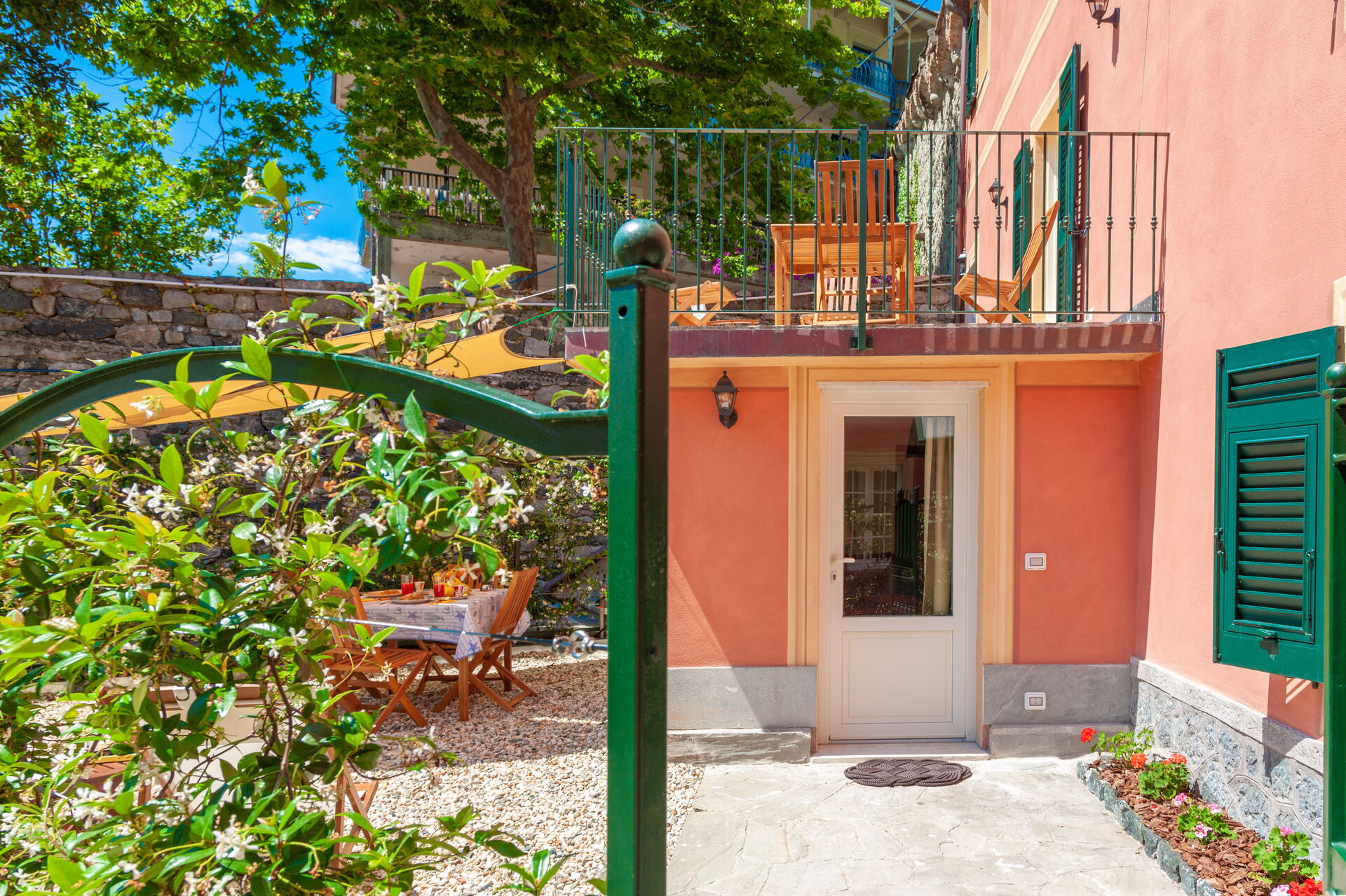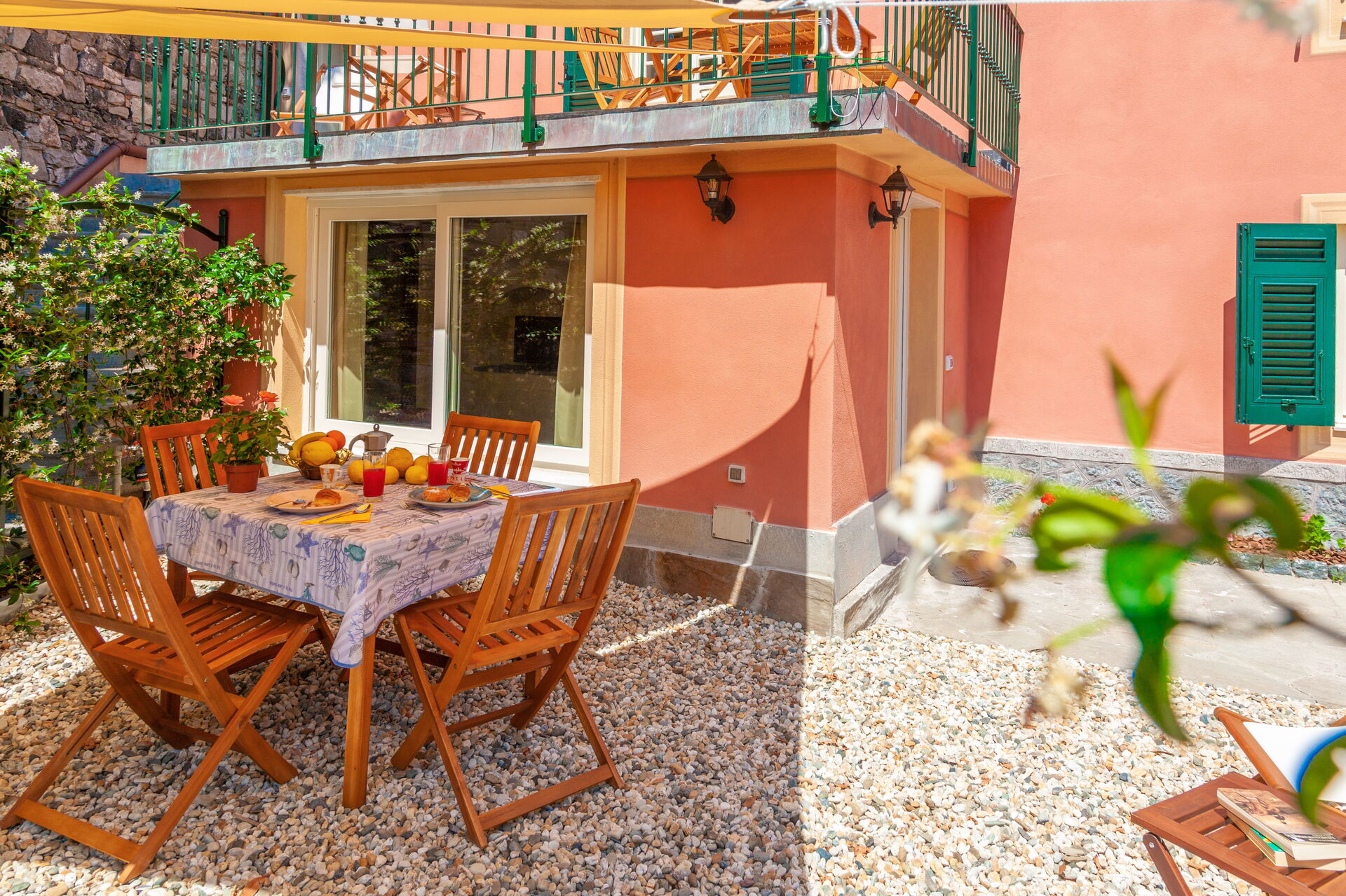 On the ground floor, with a small private garden, equipped with table, chairs and sunshade.
