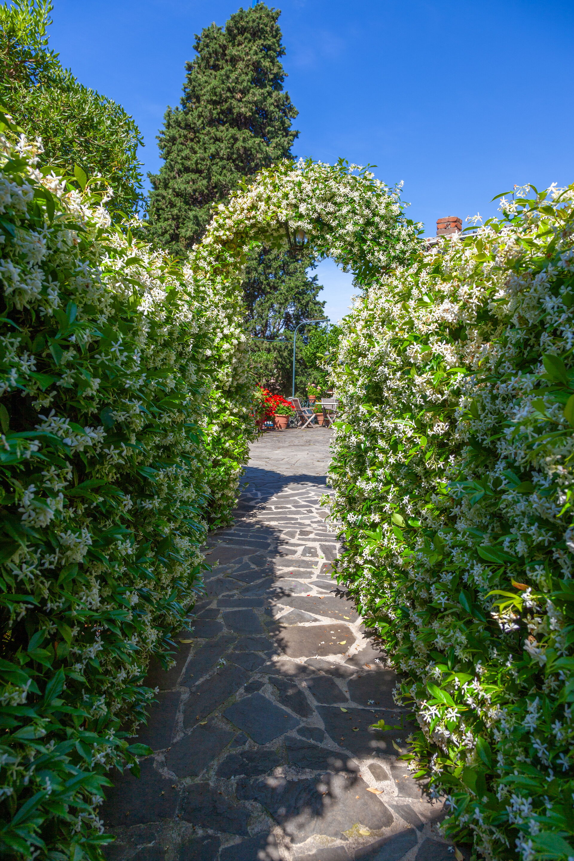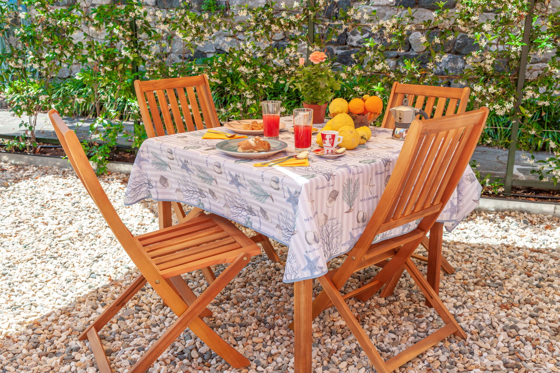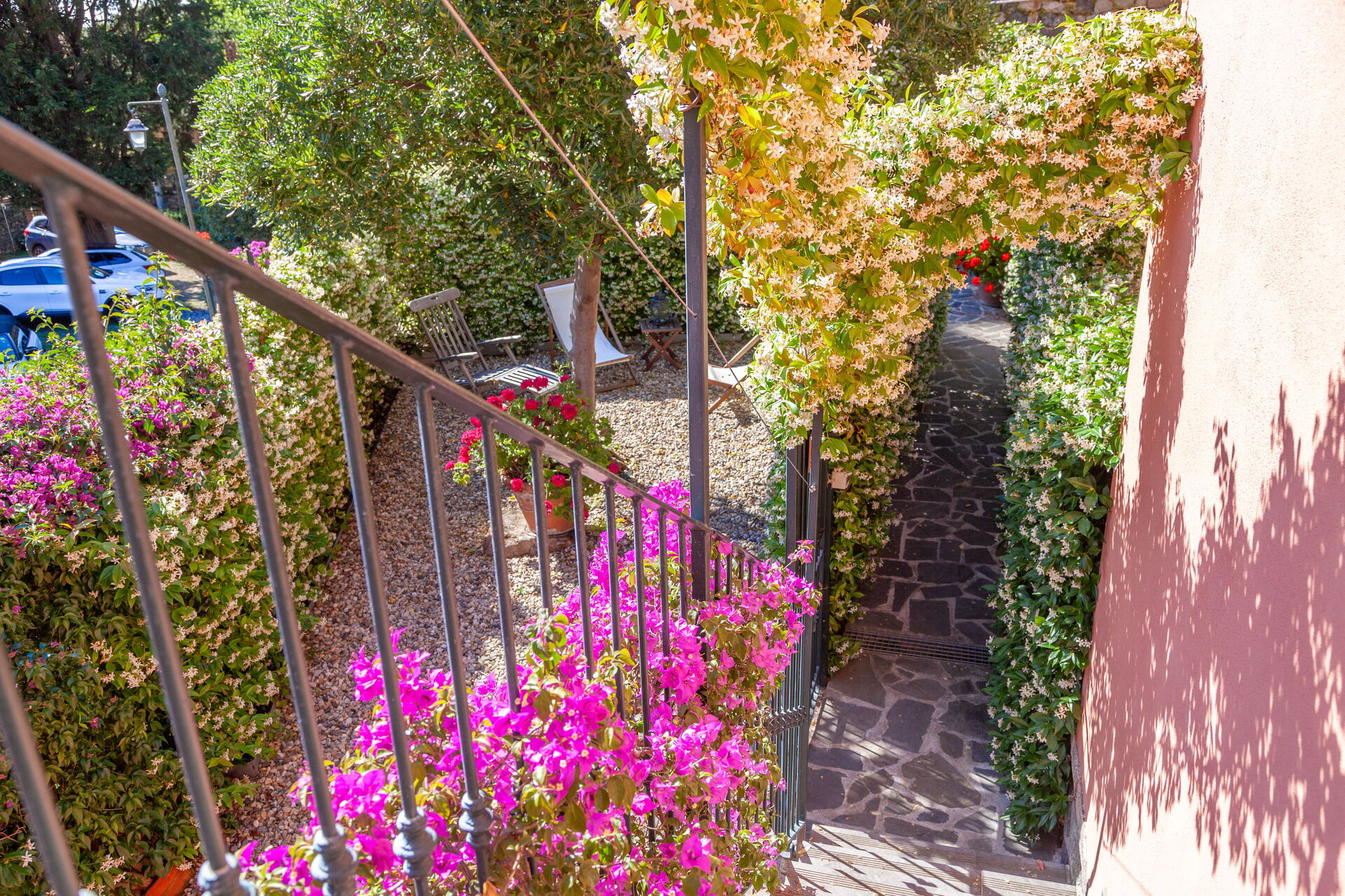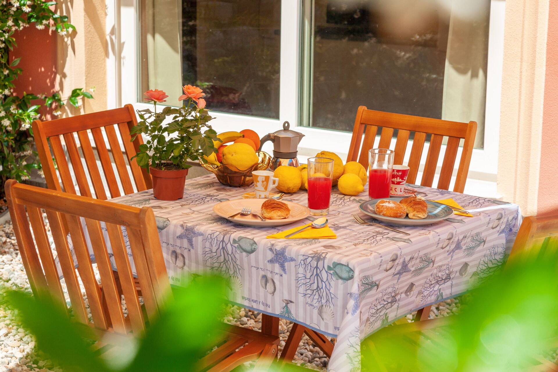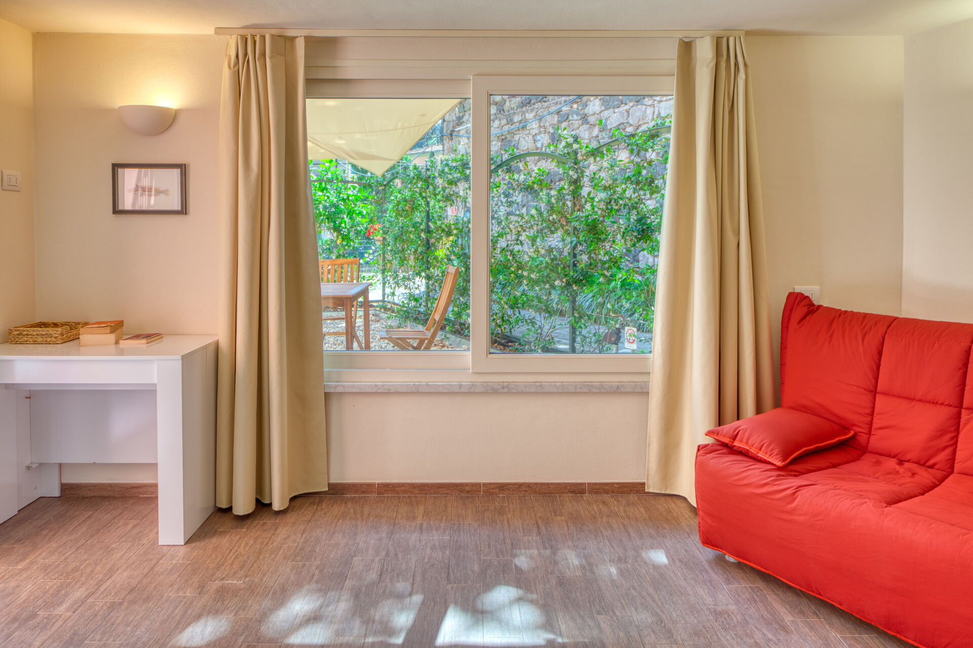 On the ground floor, with a small private garden, equipped with table, chairs and sunshade.