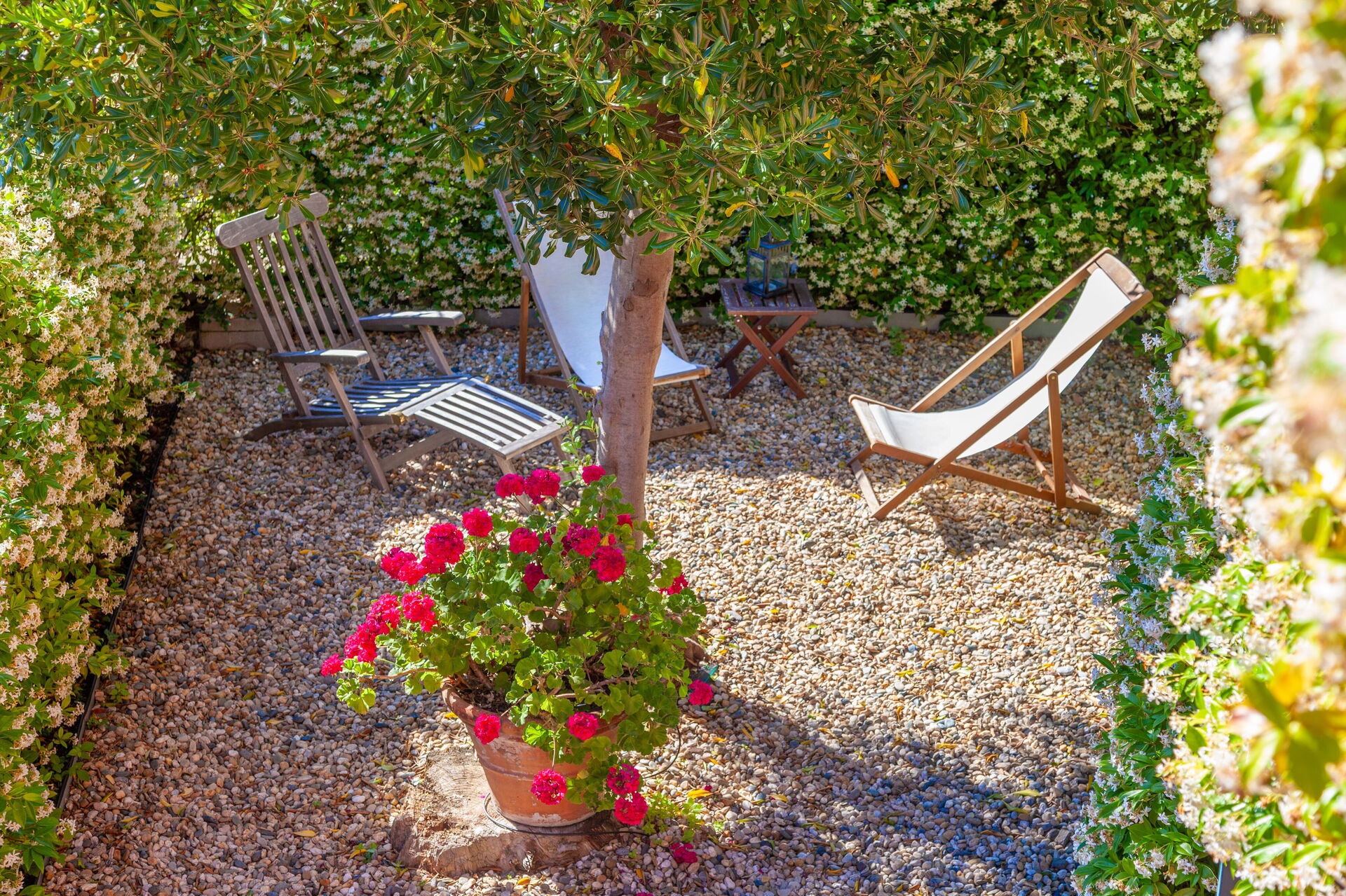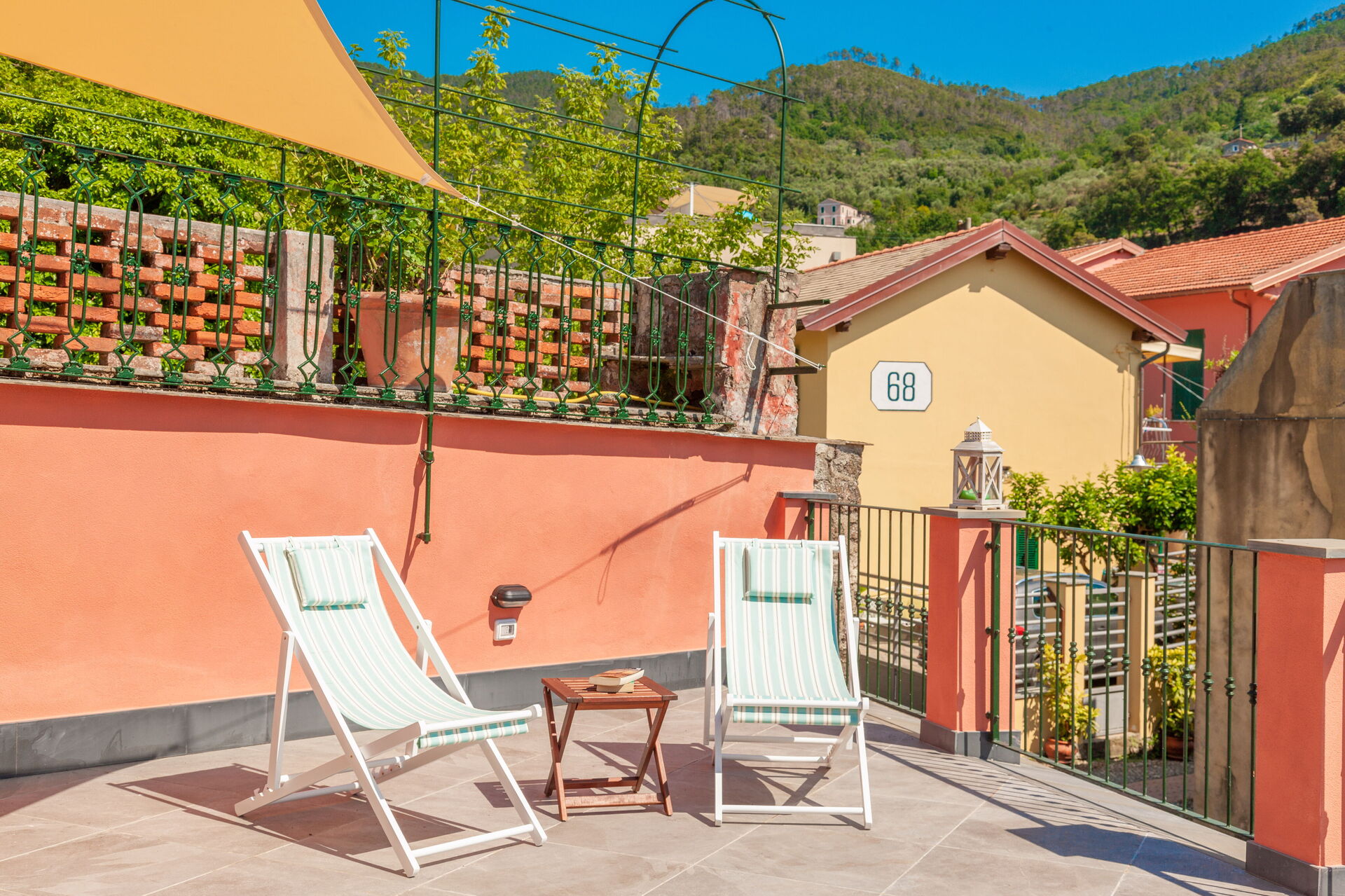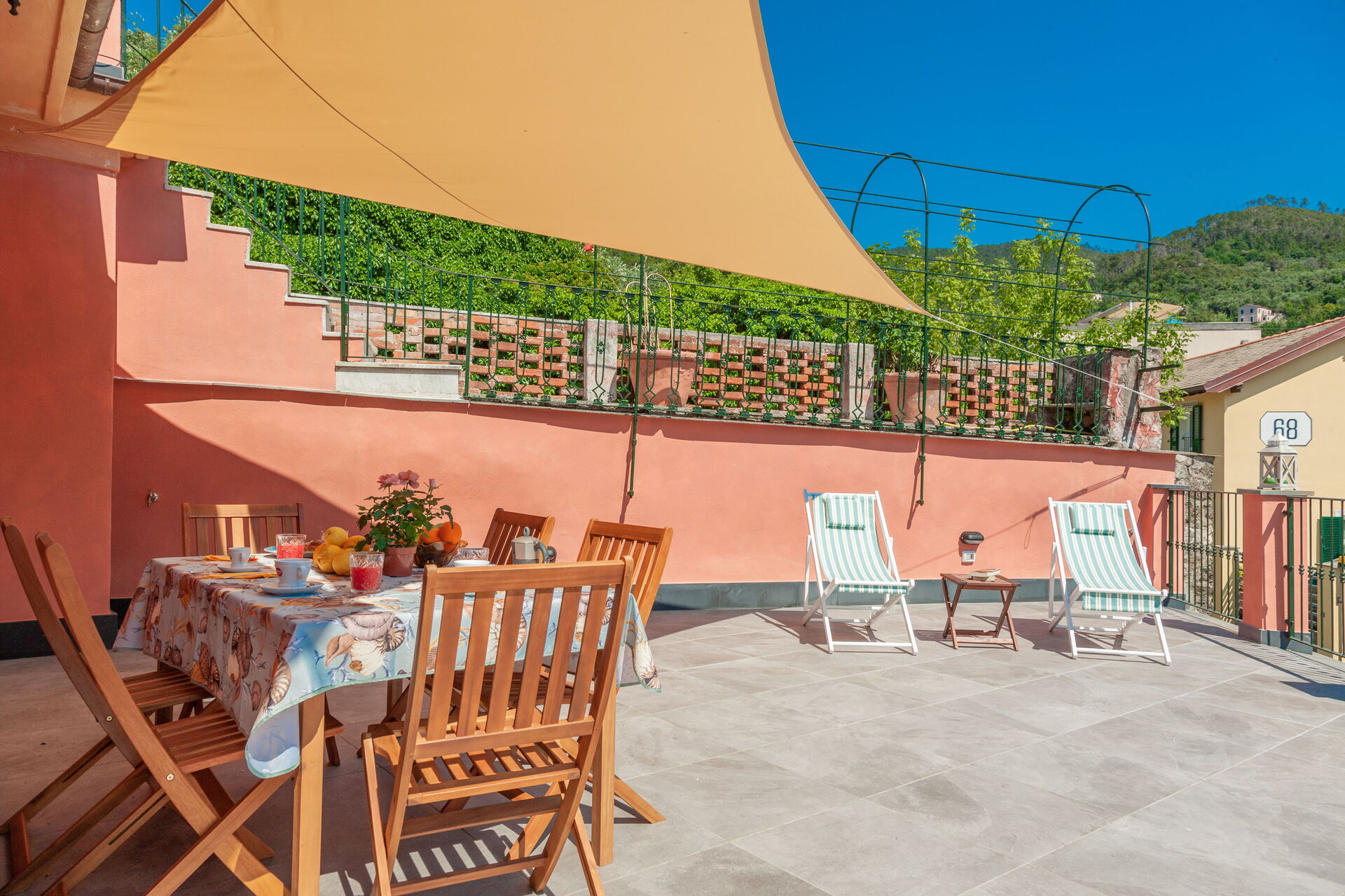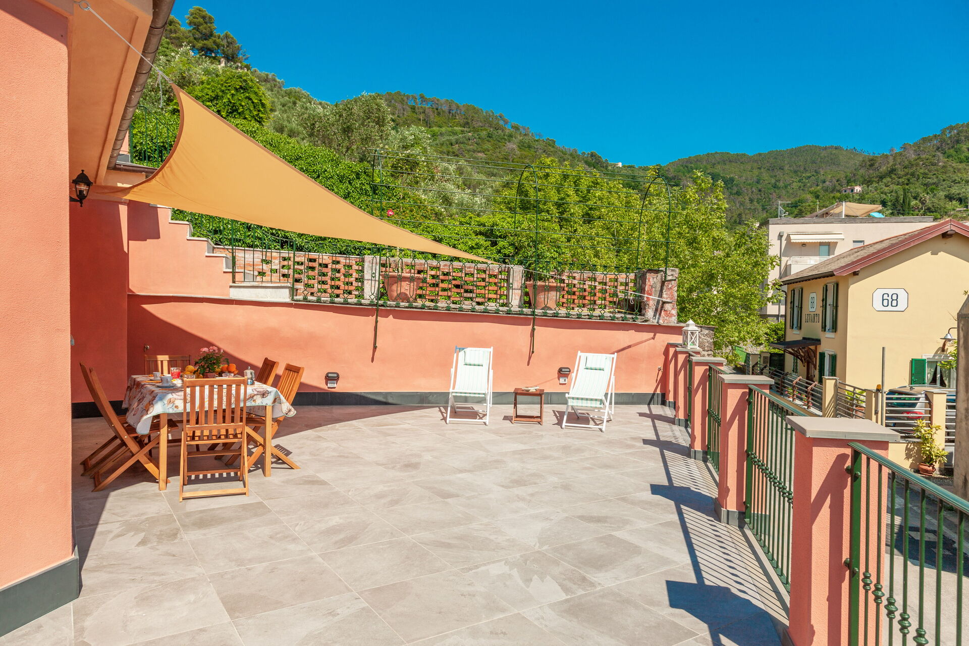 Large terrace with table, chairs and sunshade.