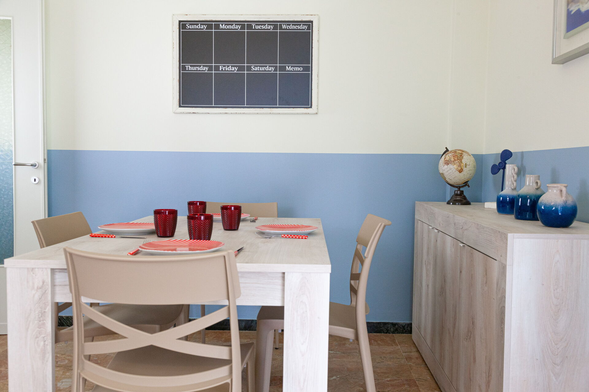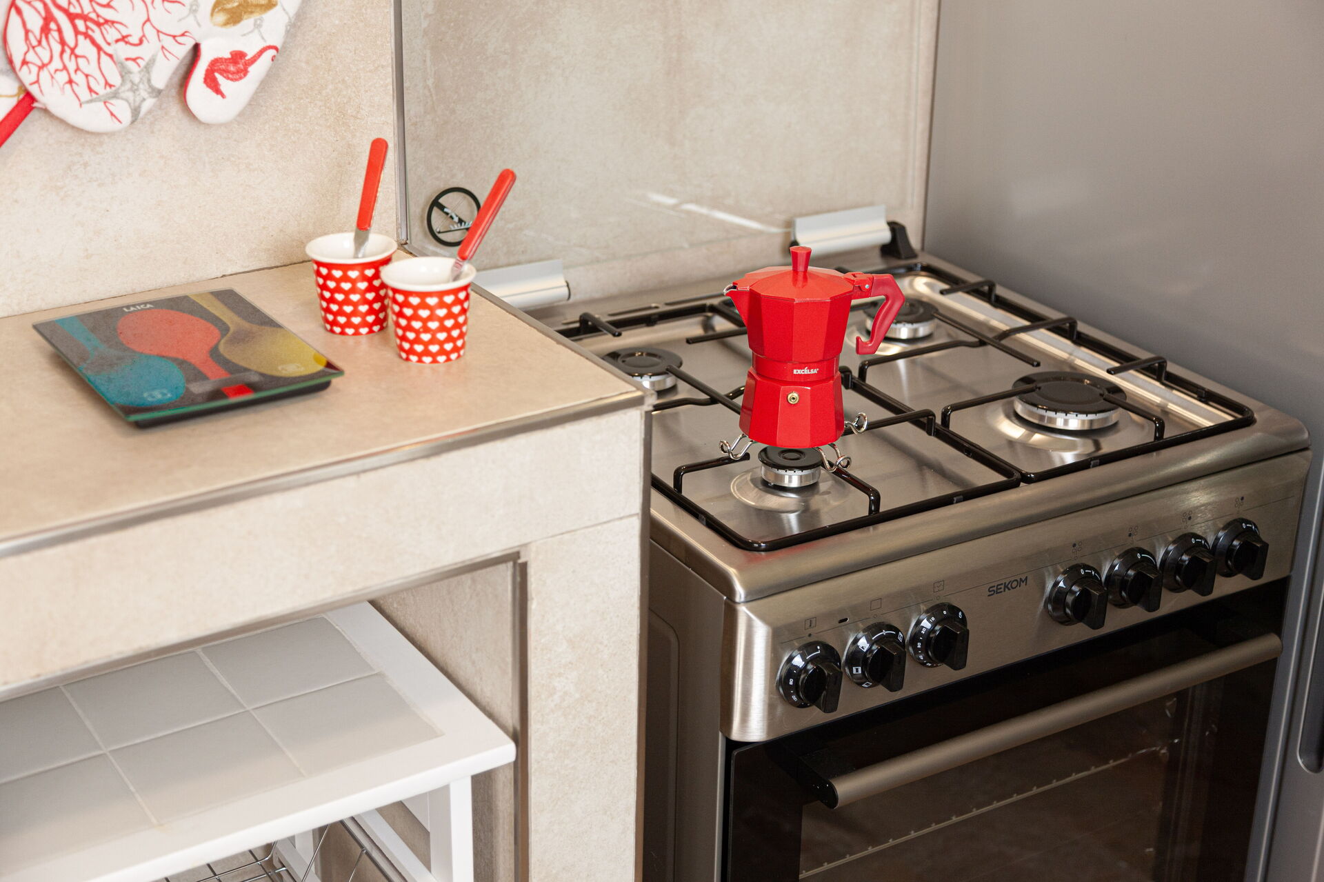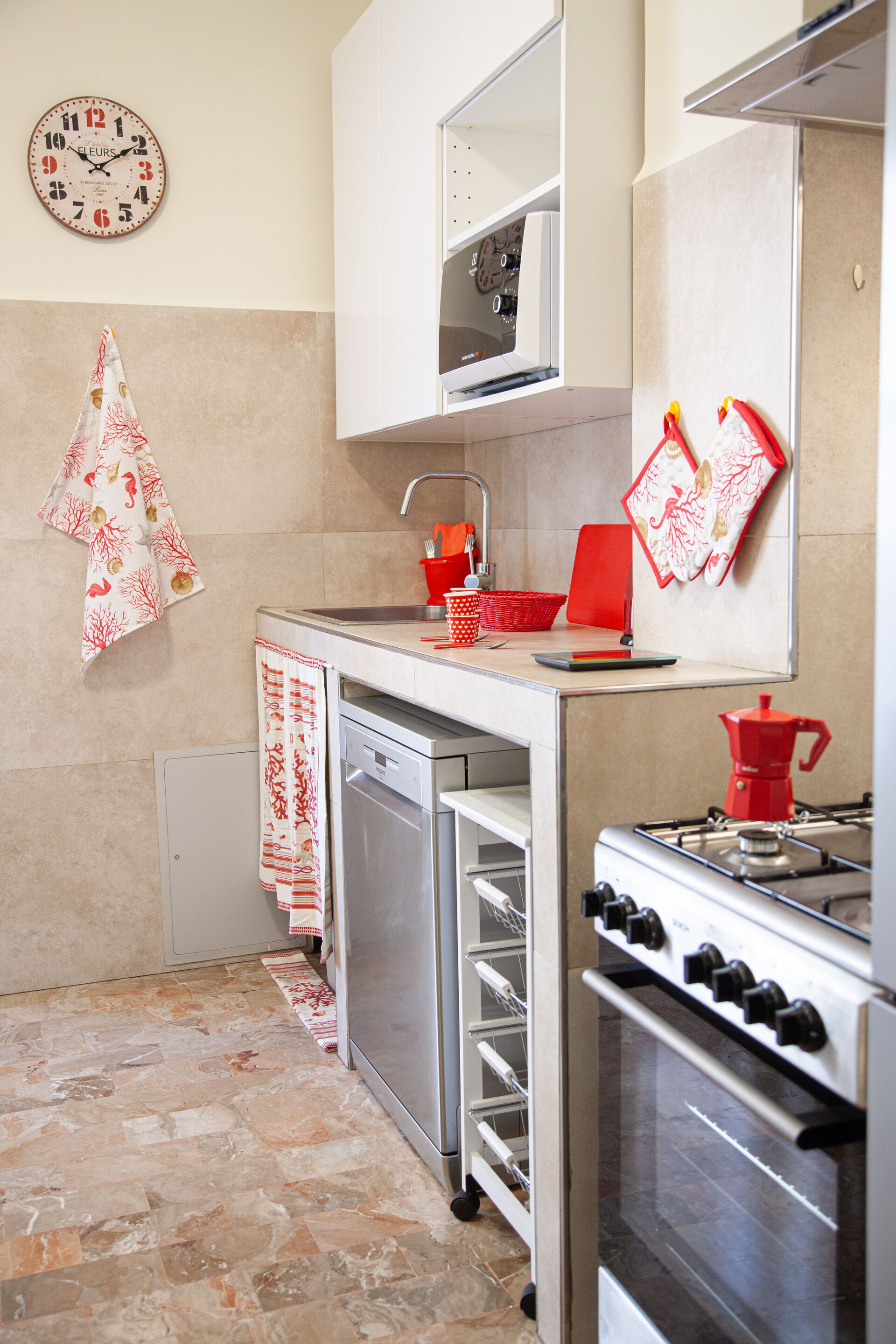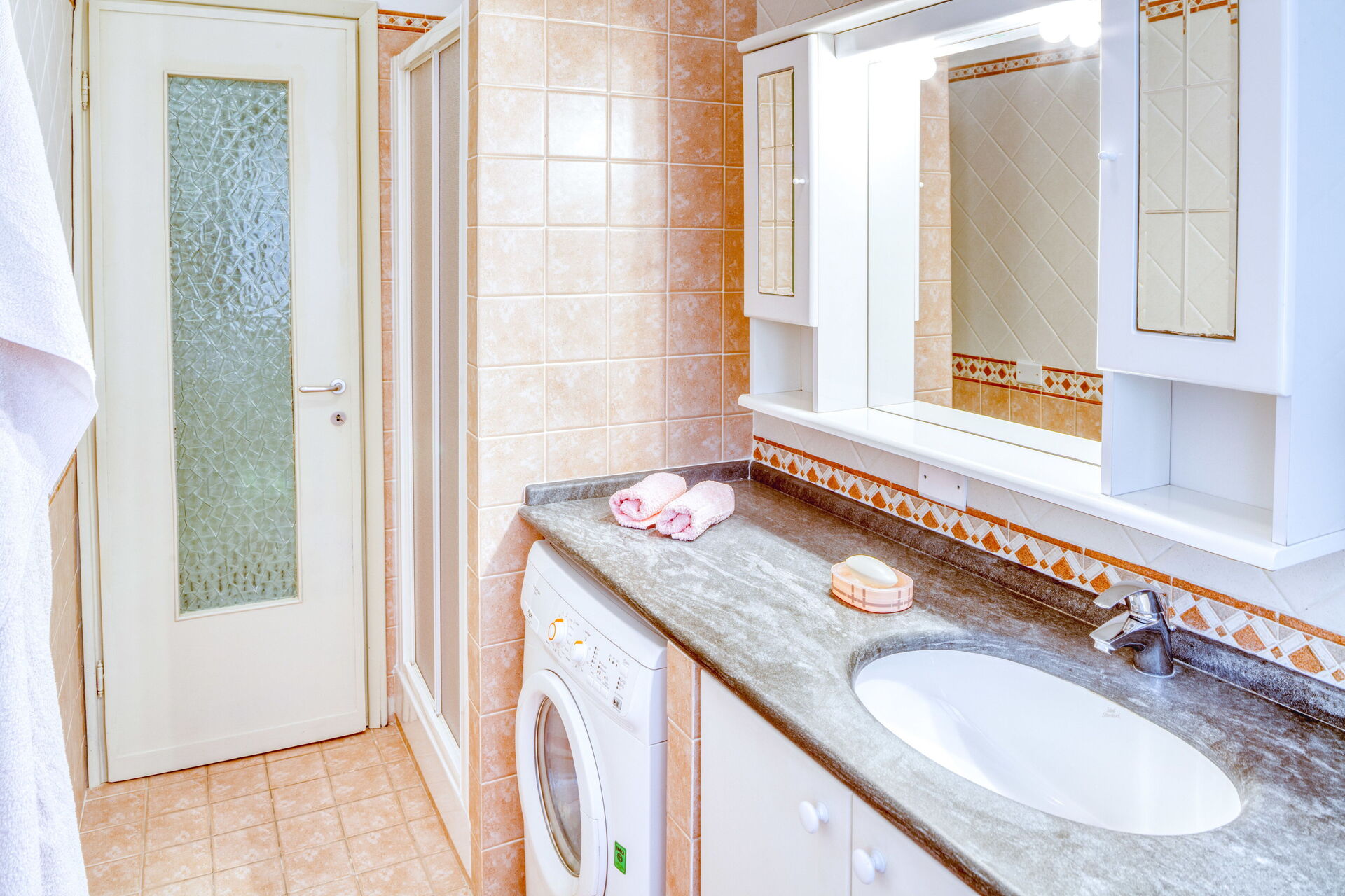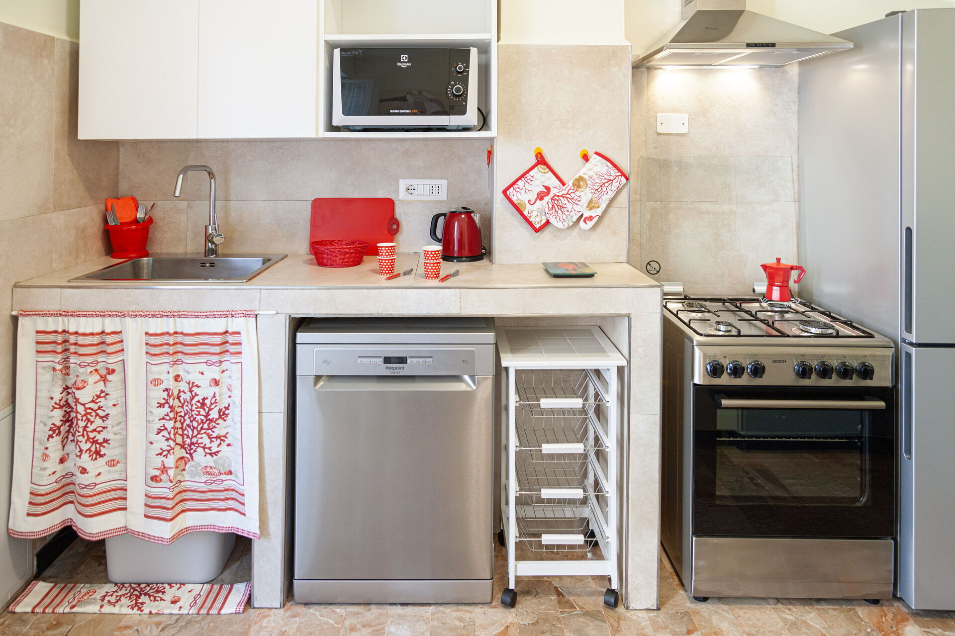 Ausgestattet mit: Spülmaschine, Waschmaschine, Backofen, 4-Flammen-Herd, Mikrowelle, Kühlschrank, Gefriertruhe.