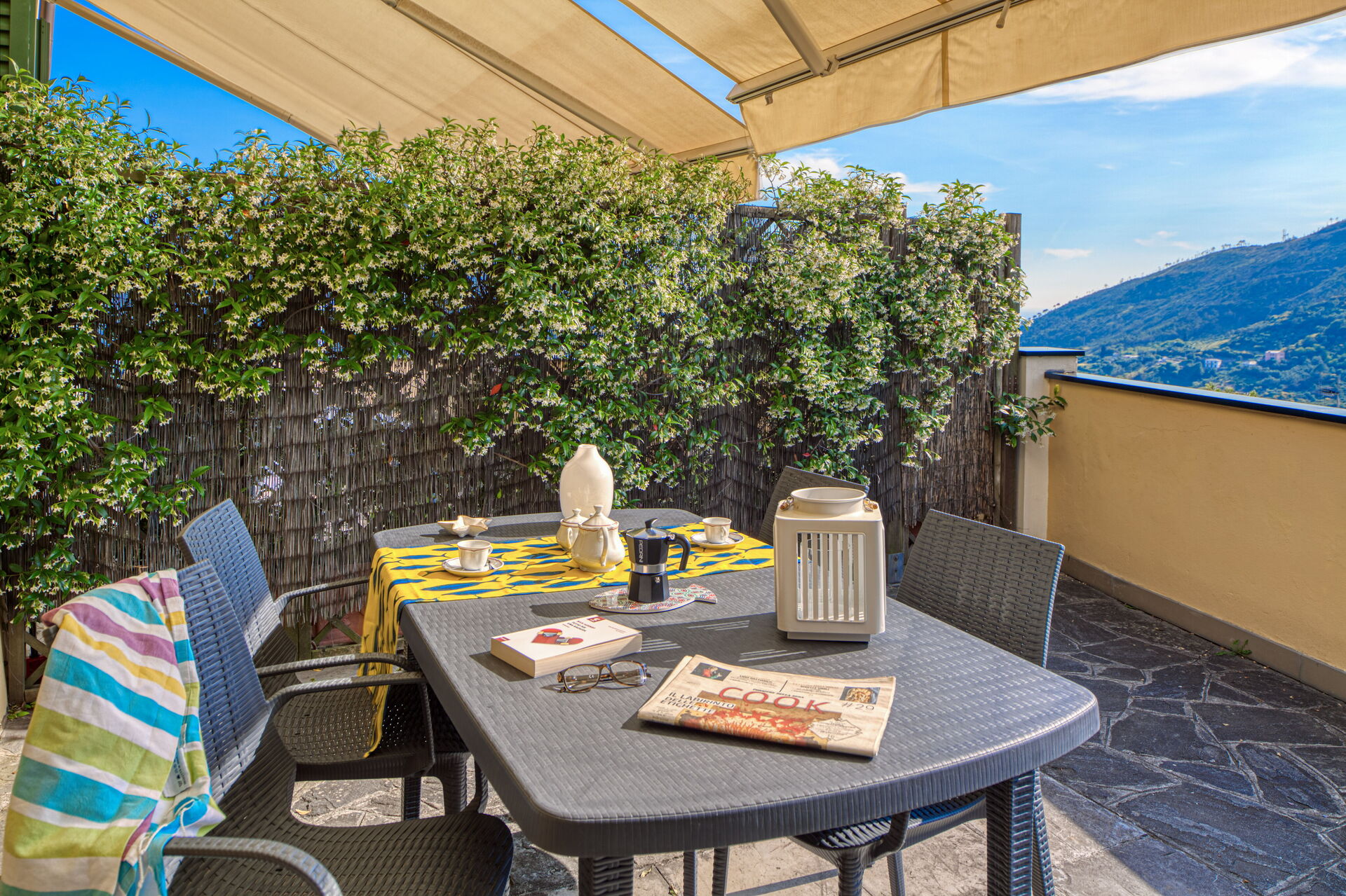 Terrasse avec store motorisé, table et chaises, avec une vue imprenable sur le golfe de Levanto.