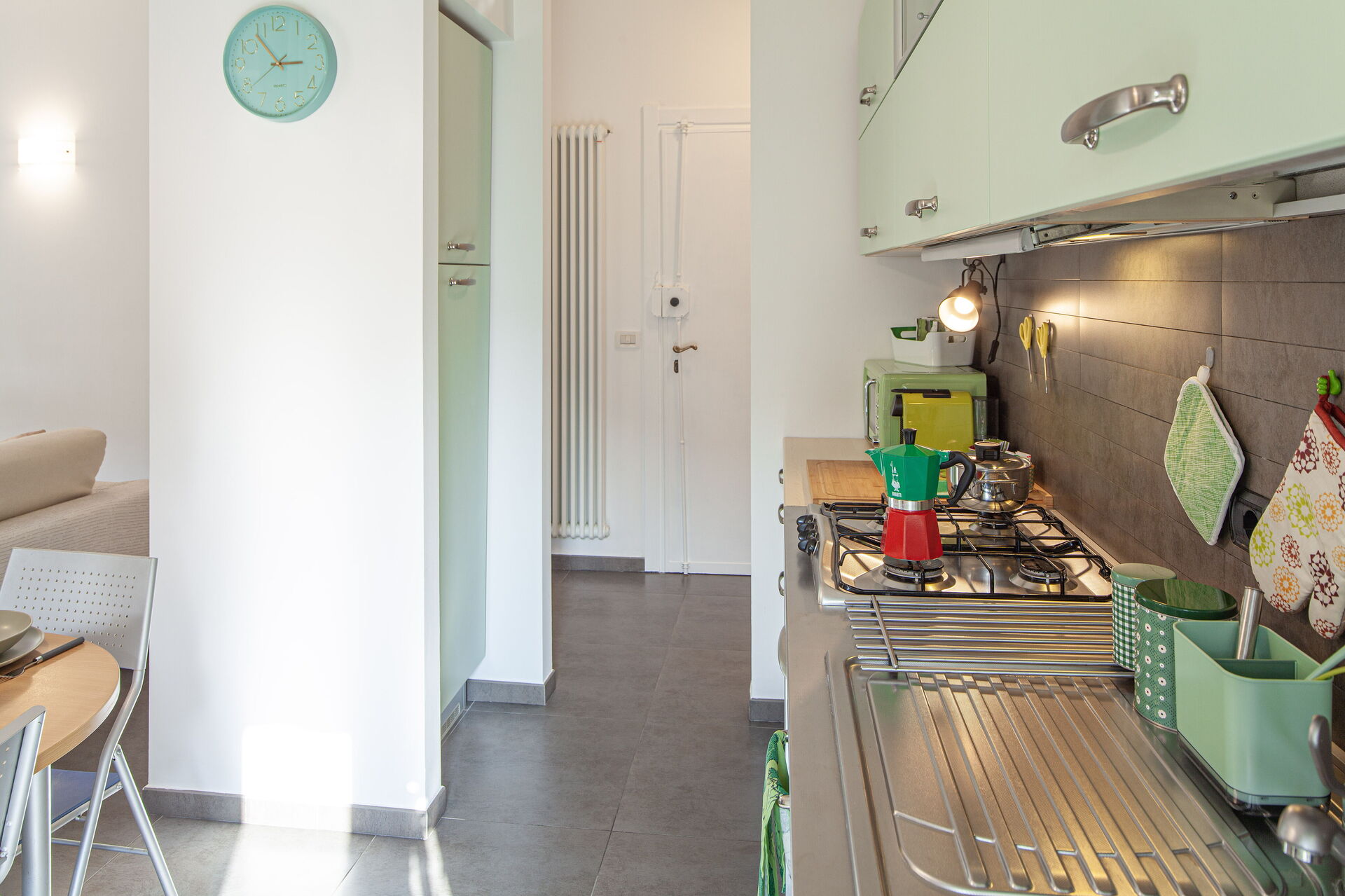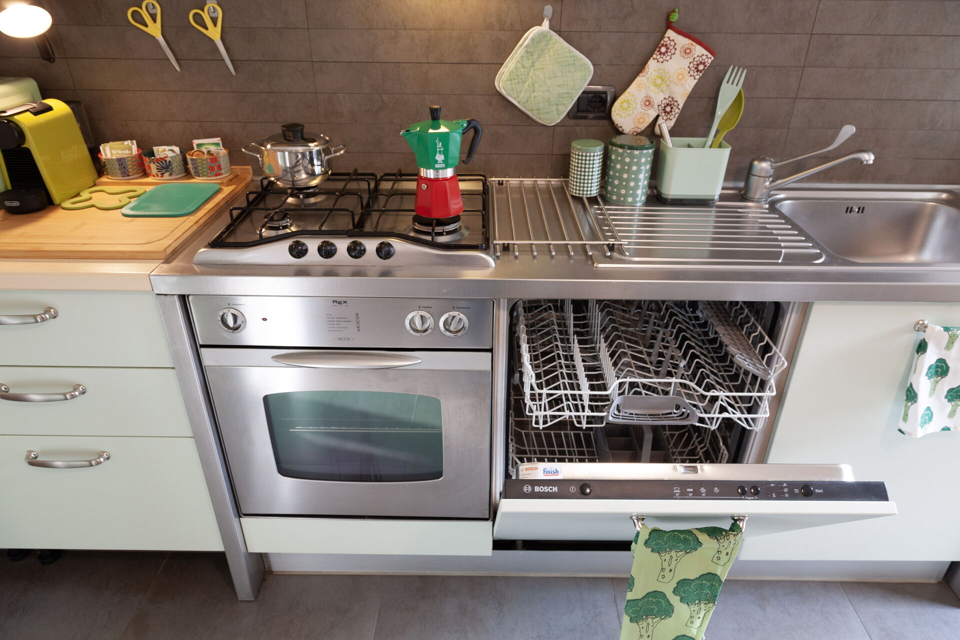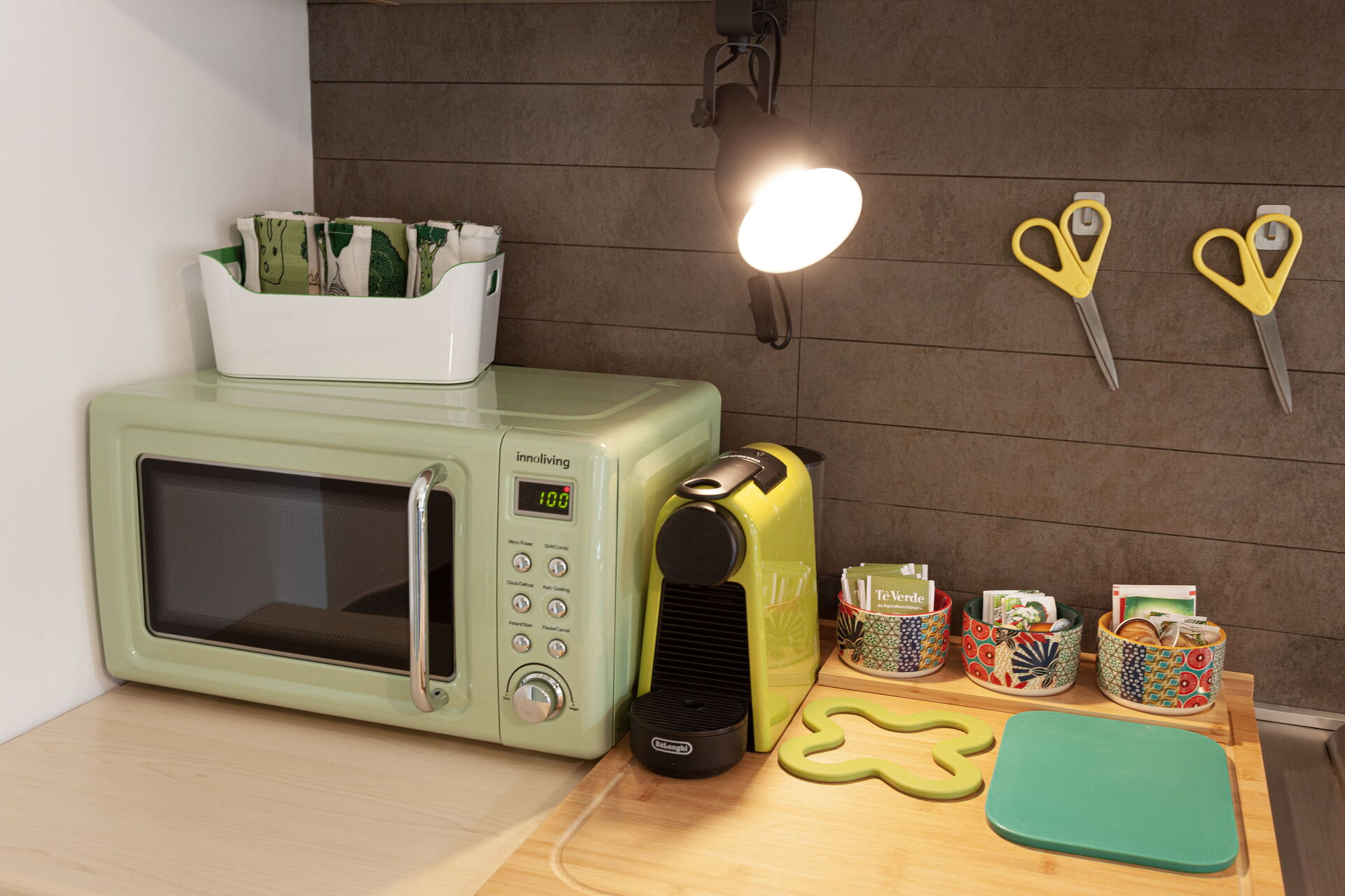 Dans la cuisine il y a : four micro-ondes, cafetière Nespresso, cafetière américaine, moka italien, grille-pain, bouilloire électrique.