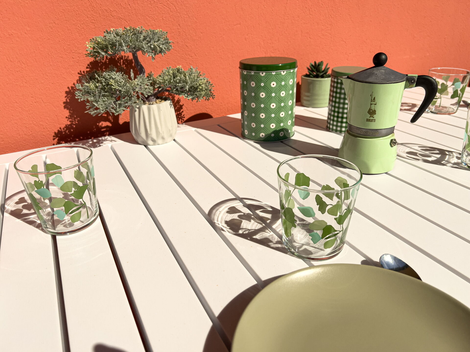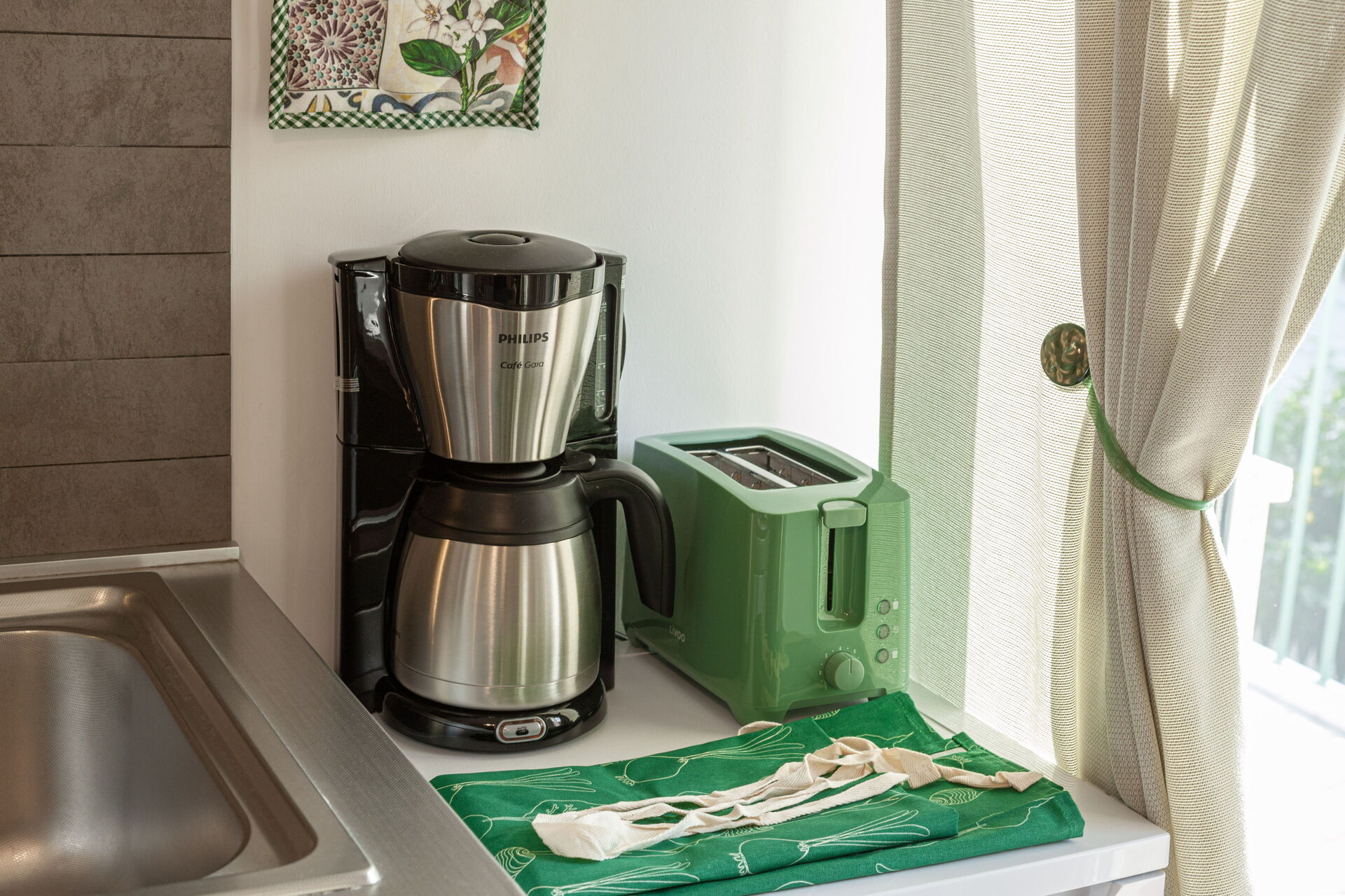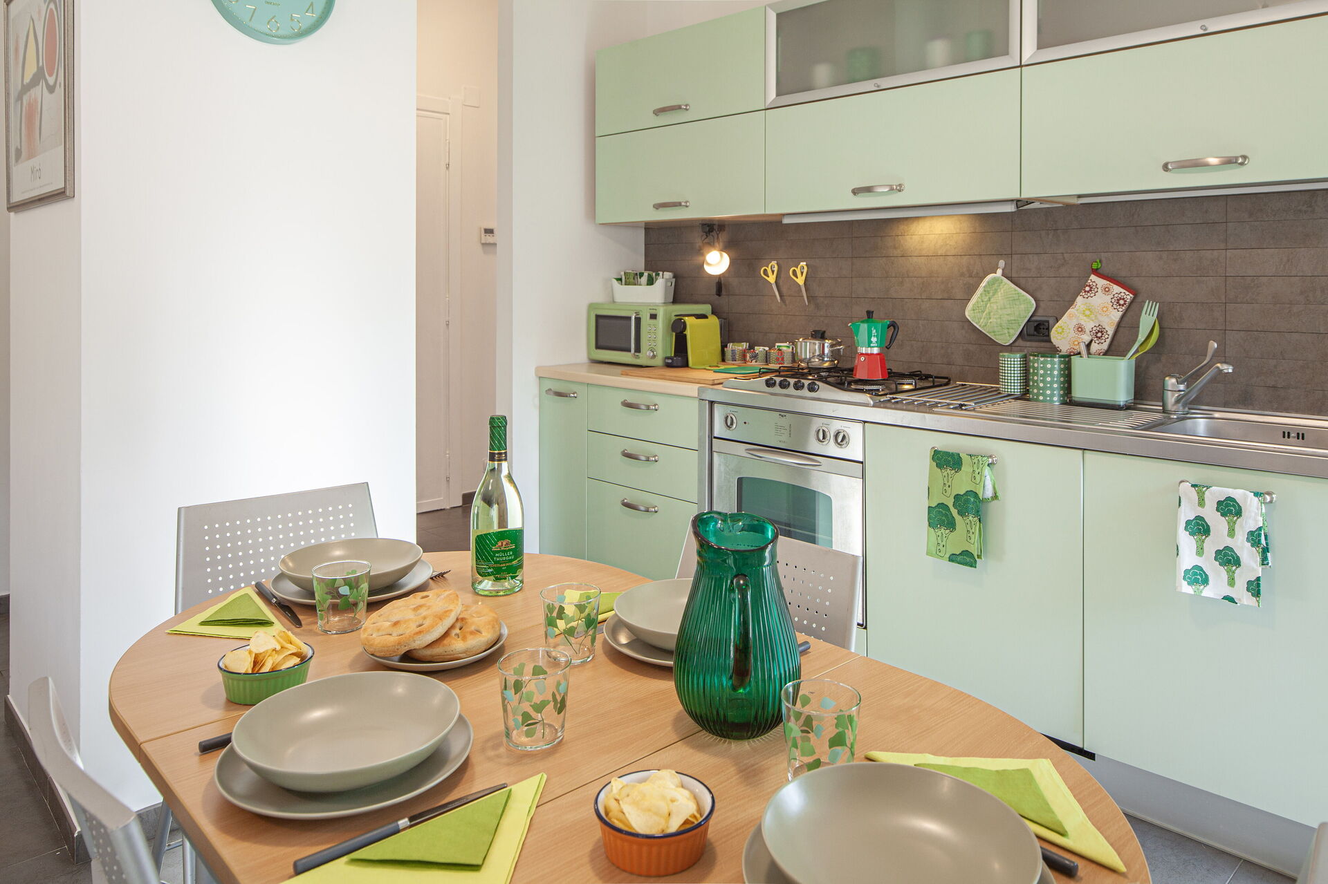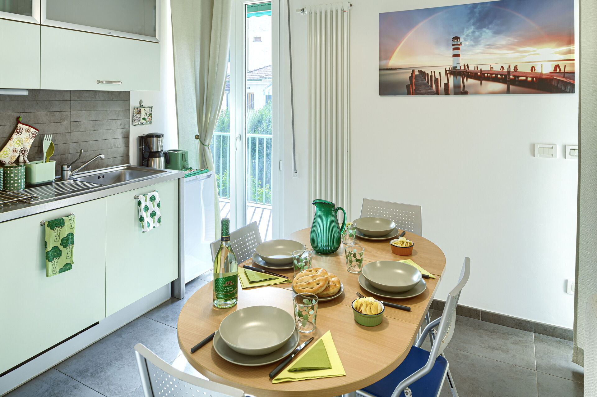 Dans la cuisine il y a : four micro-ondes, cafetière Nespresso, cafetière américaine, moka italien, grille-pain, bouilloire électrique.
