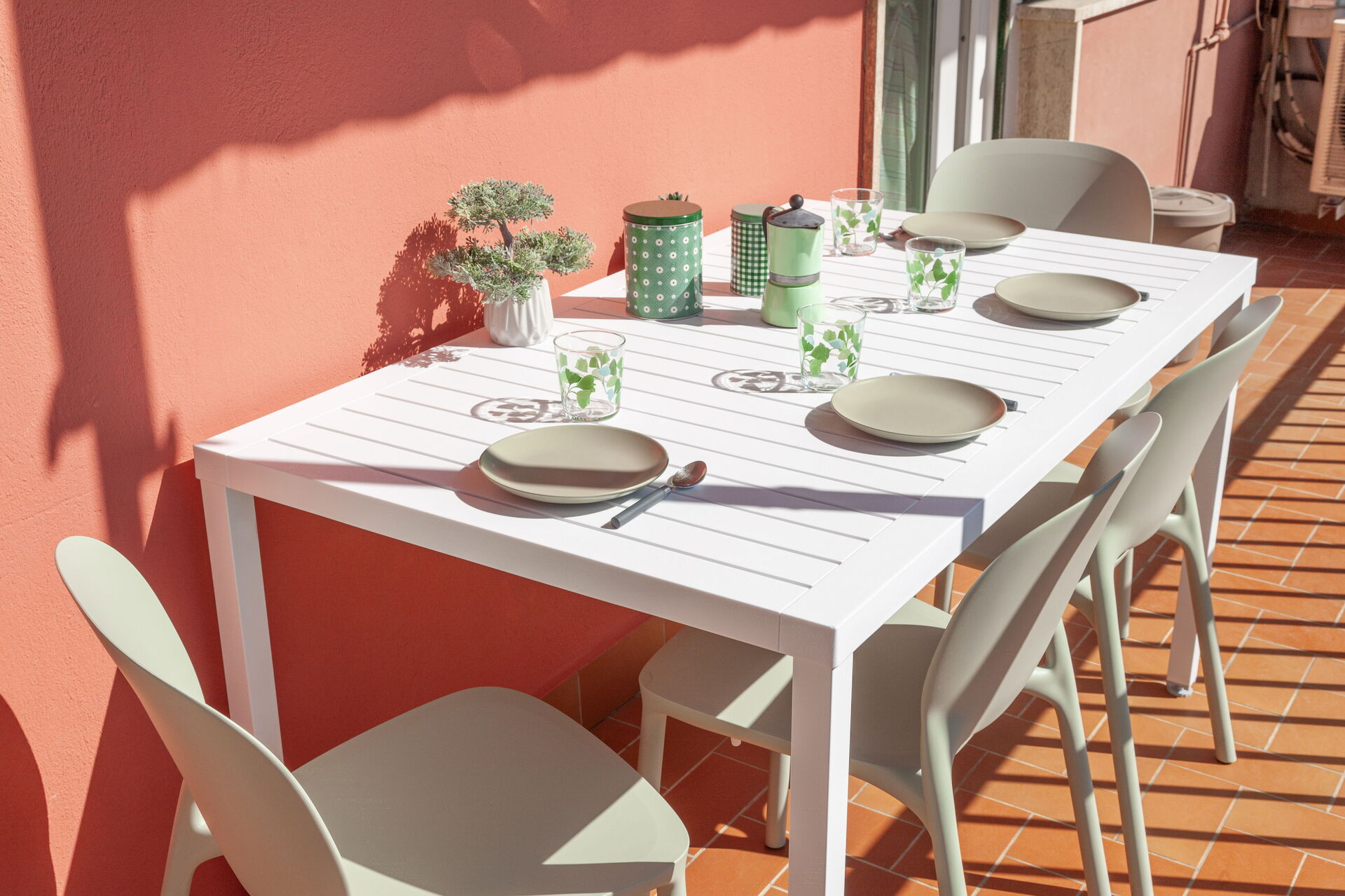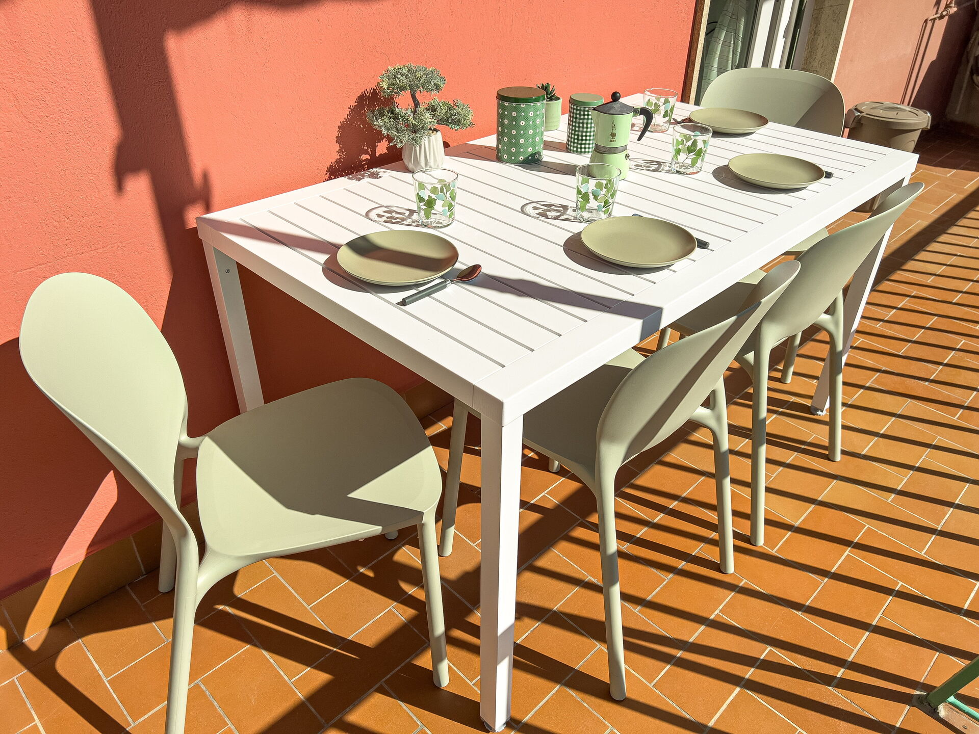 Long balcon, avec table et deux chaises, équipé de rideau.