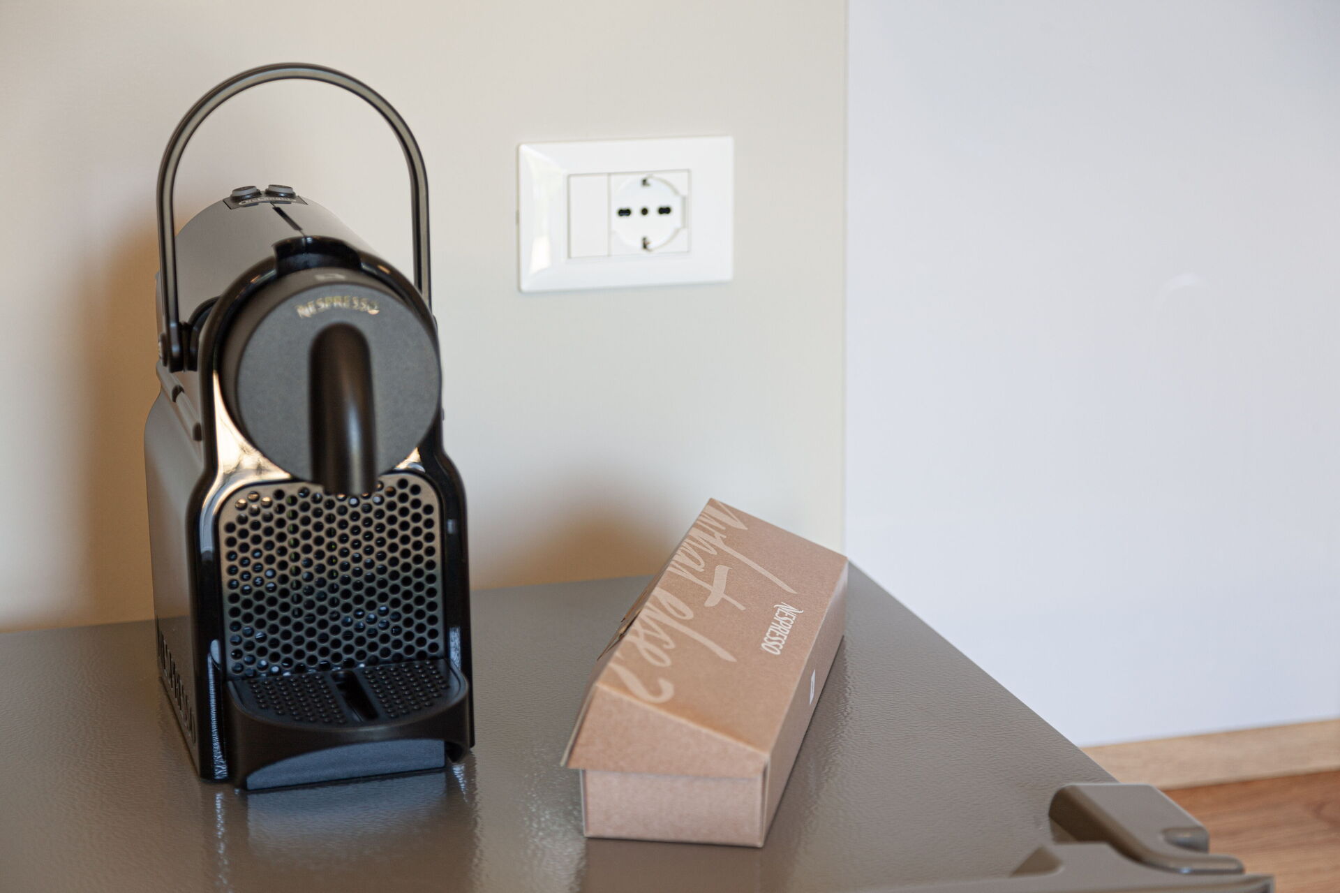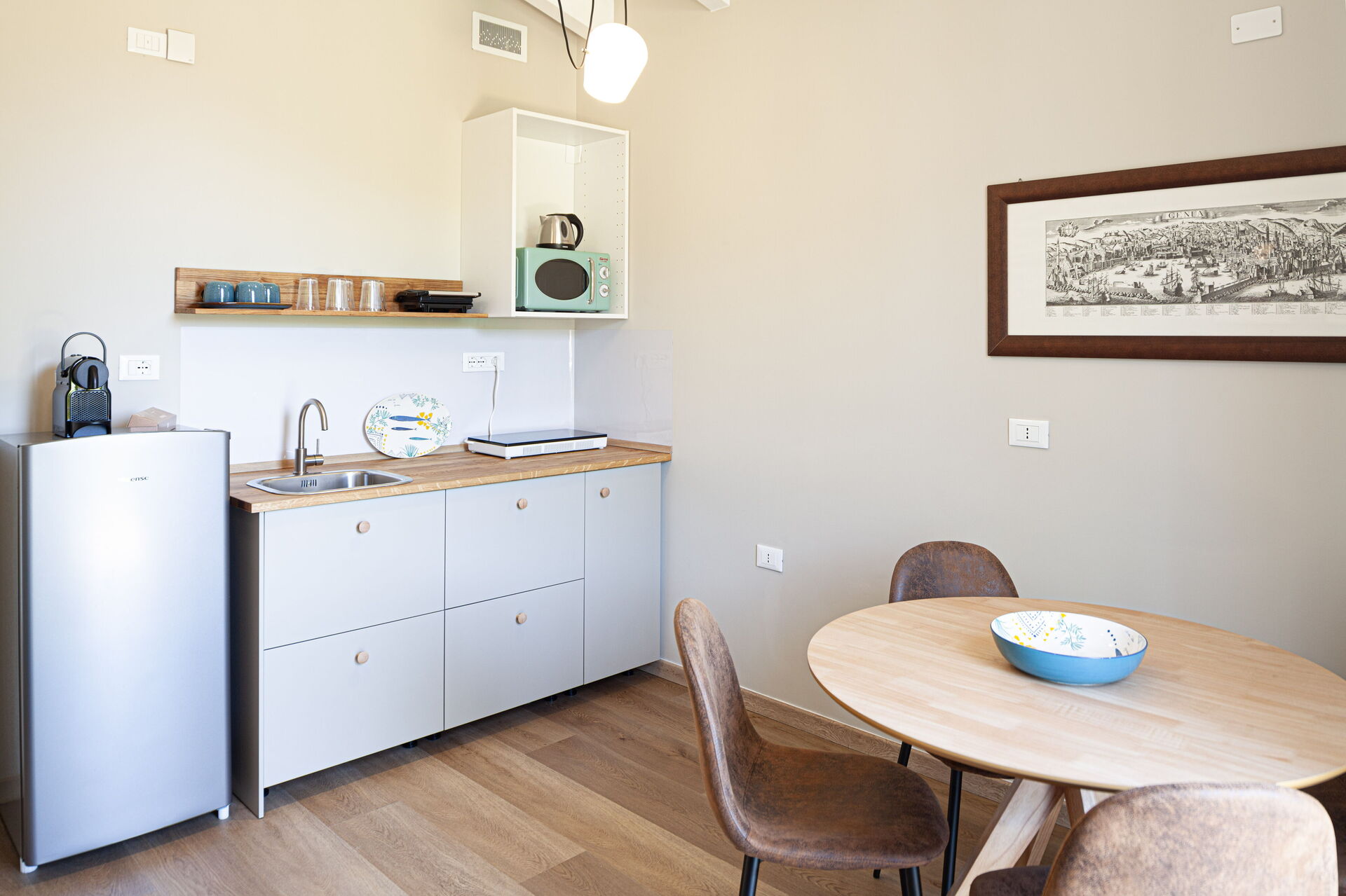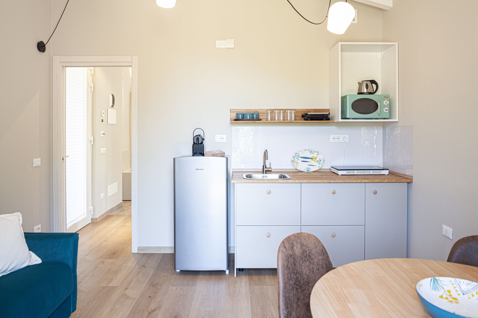 - Une pièce à vivre avec kitchenette, équipée de plaques à induction, four combiné (micro-ondes + grill), évier, réfrigérateur avec compartiment congélateur, cafetière Nespresso, cafetière américaine, Moka italien, bouilloire électrique. Table à manger avec 4 chaises.