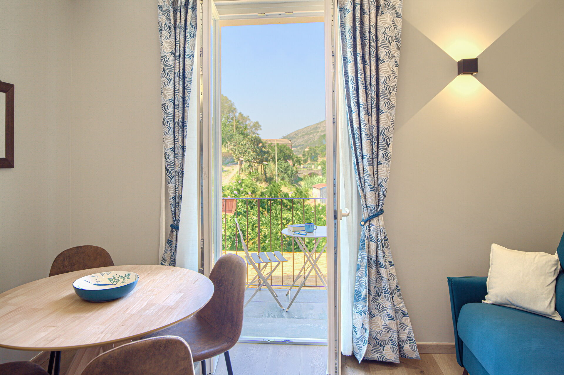 Suite équipée, quarante mètres carrés, avec petit balcon avec table et deux chaises.