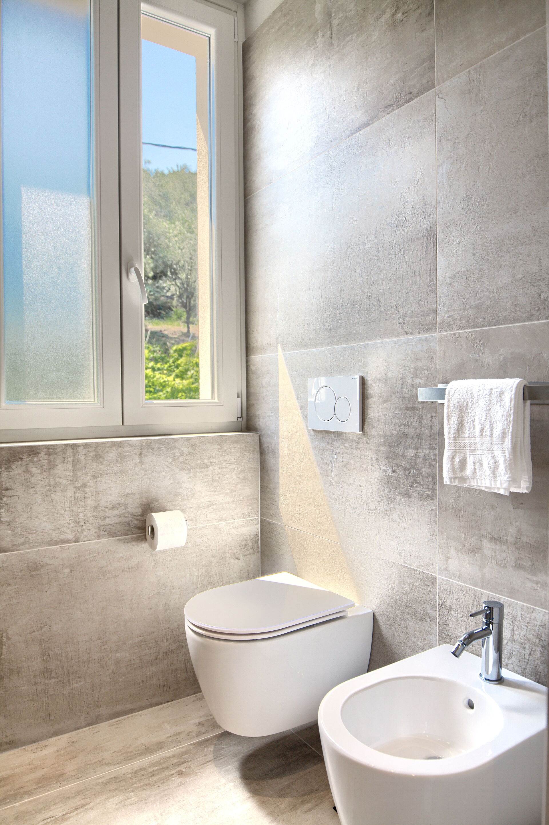 - Salle de bain avec lavabo, douche, toilette et bidet.