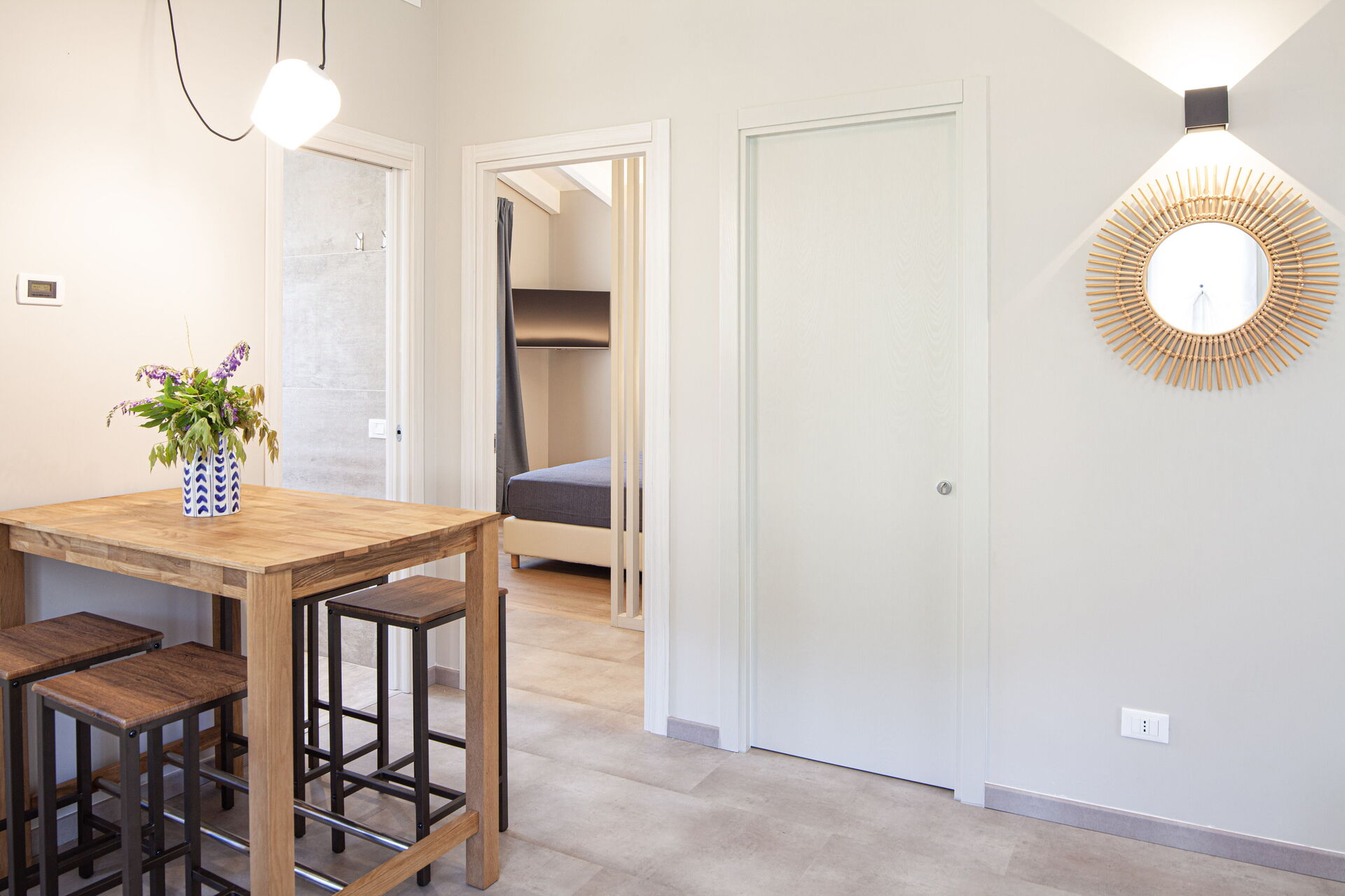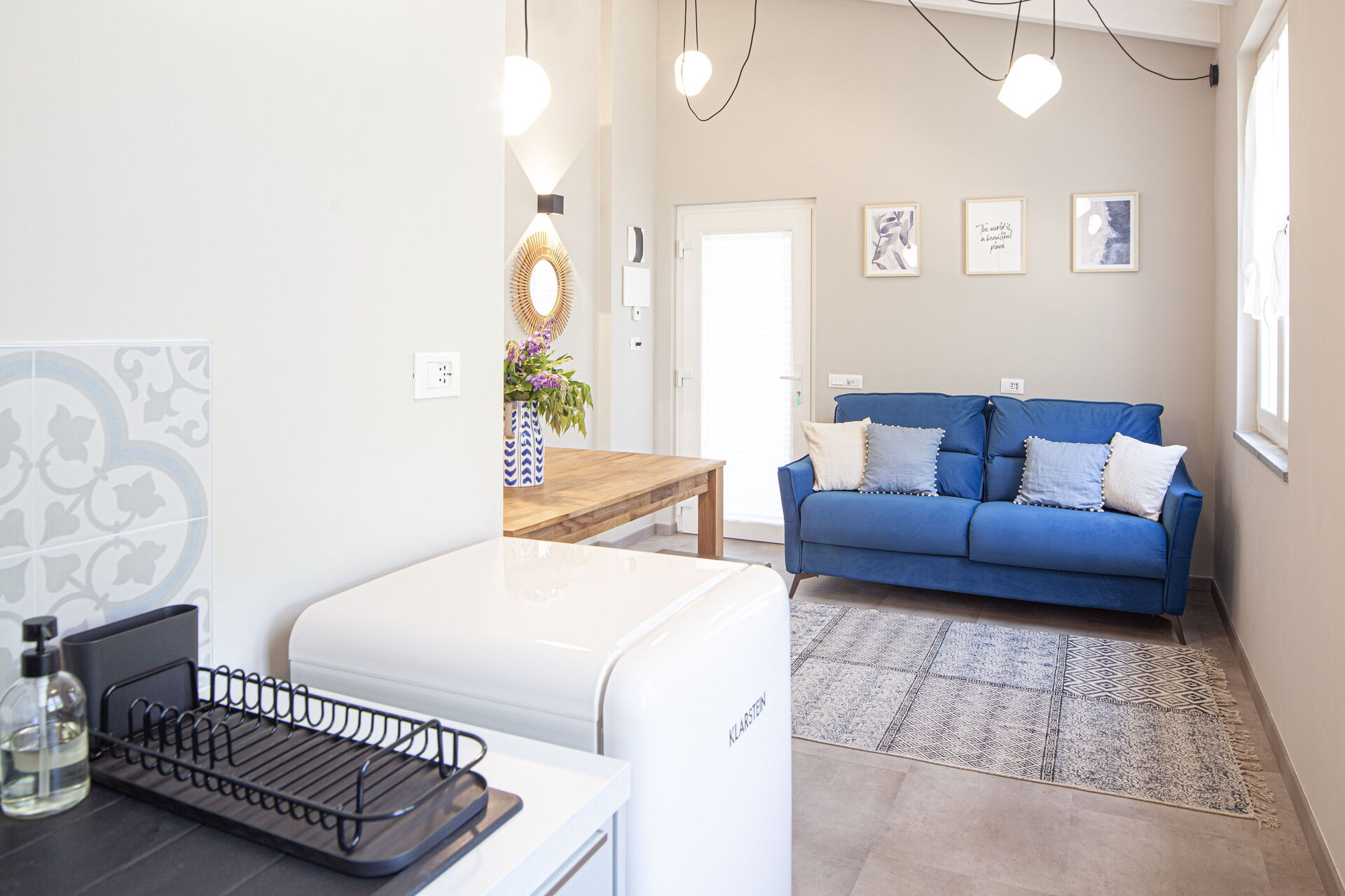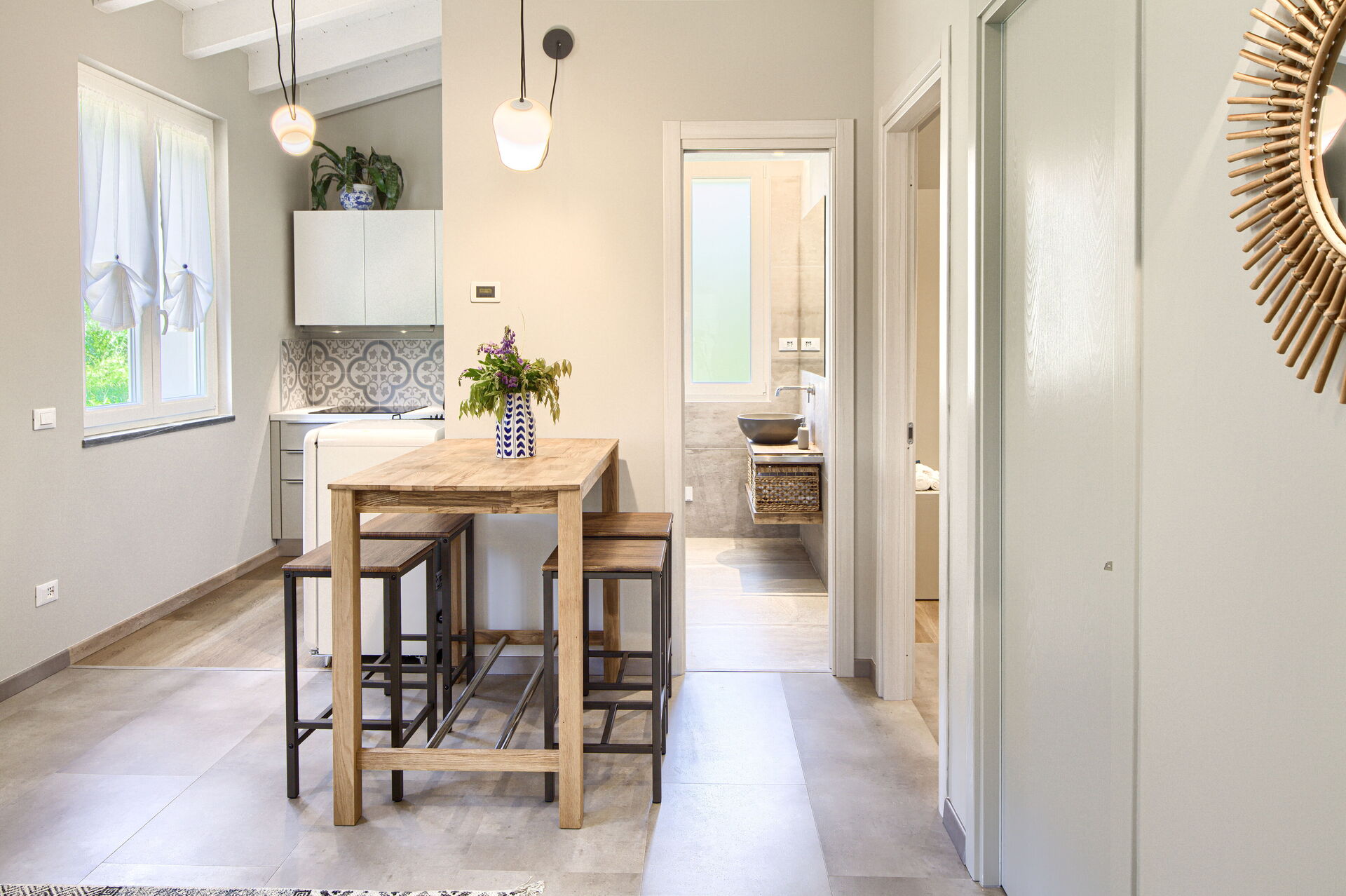 - Une pièce à vivre avec kitchenette, équipée de plaques à induction, four combiné (micro-ondes + grill), évier, réfrigérateur avec compartiment congélateur, cafetière Nespresso, cafetière américaine, Moka italien, bouilloire électrique. Lave-vaisselle. Table à manger avec 4 chaises.