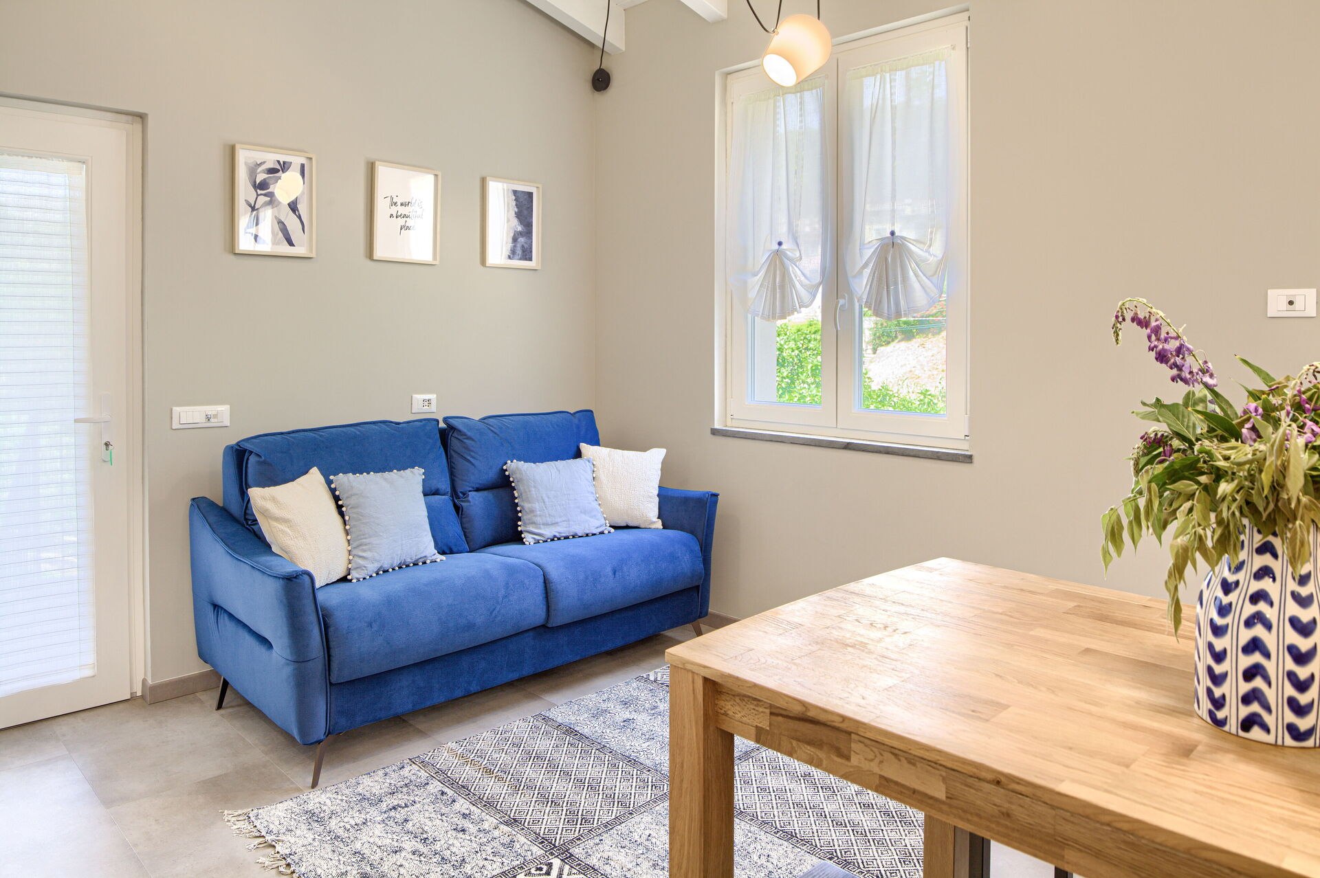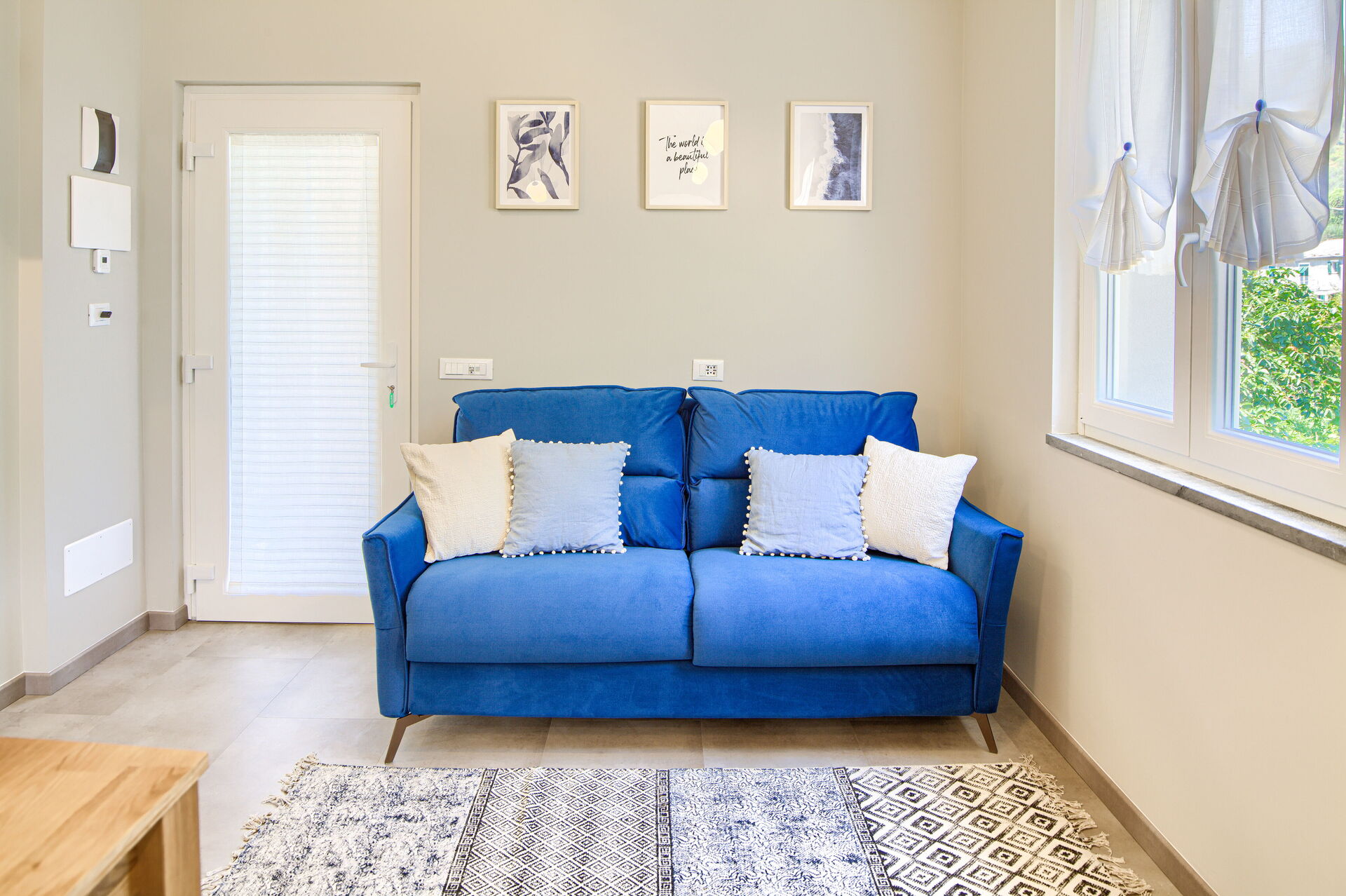 Dans le salon, il y a un canapé-lit confortable pour deux personnes, la capacité de couchage maximale est donc de 4 personnes. Remarque : le canapé-lit est un lit français, large de cent quarante centimètres, il est donc plus petit qu'un lit double.