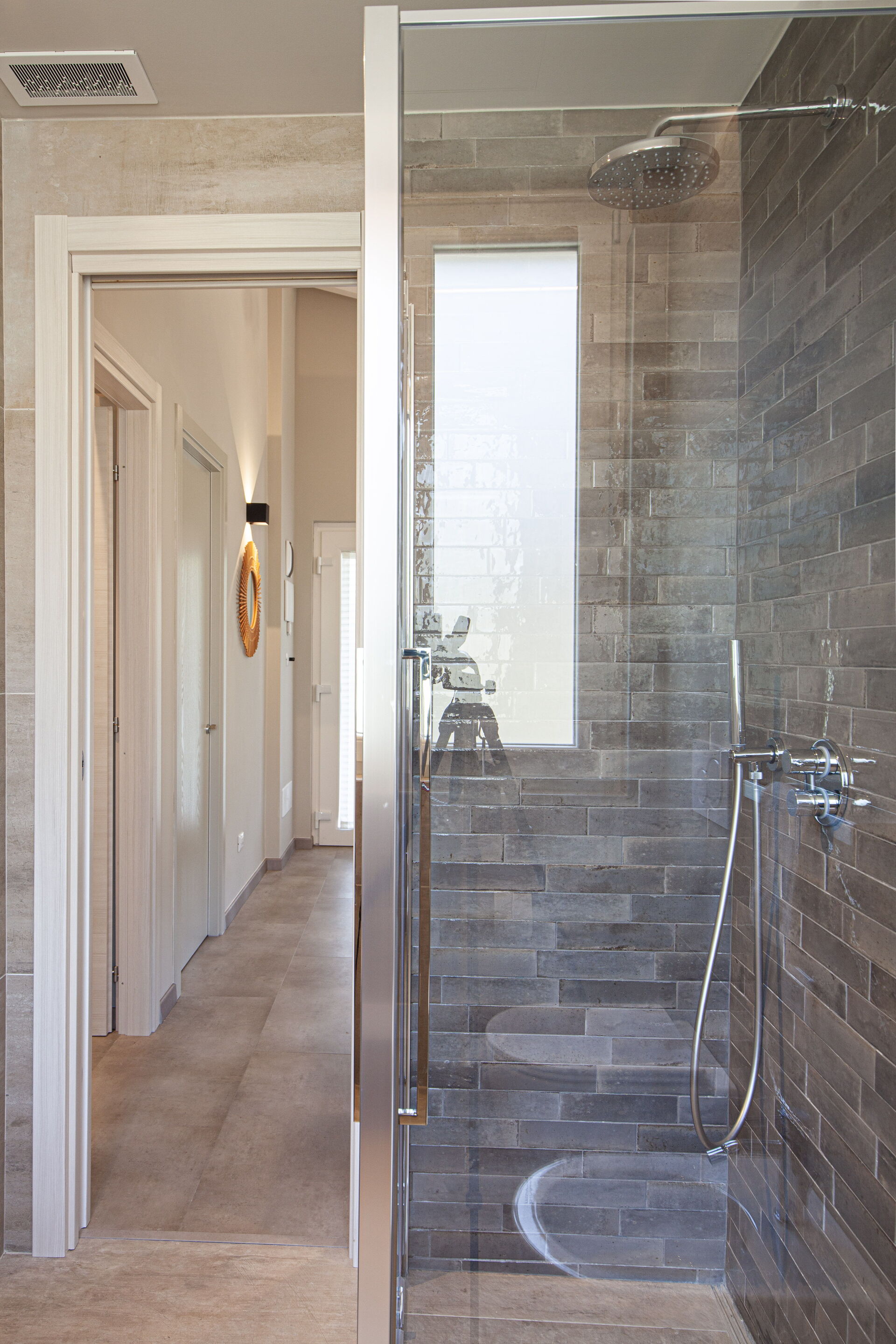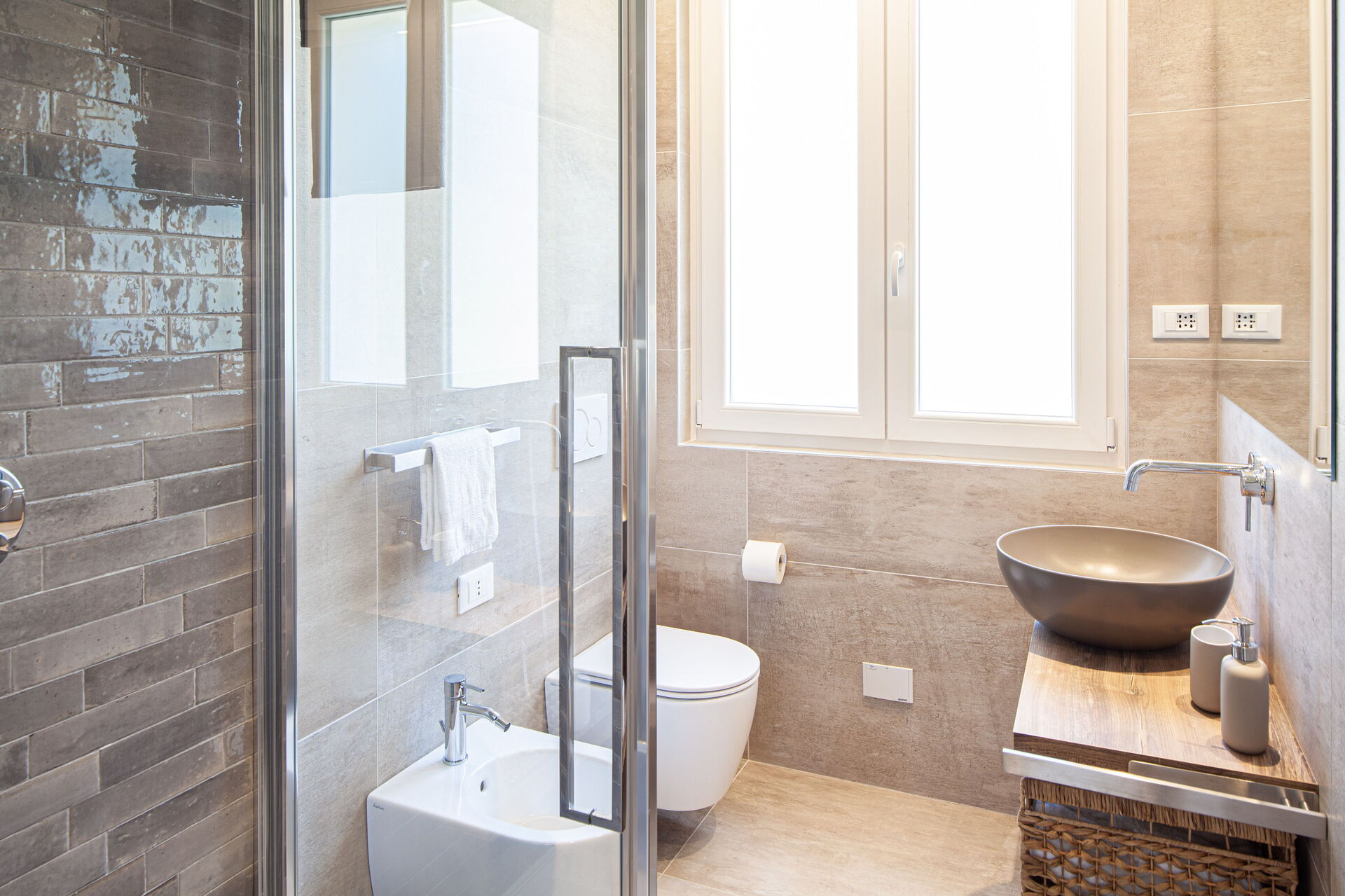 - Salle de bain avec lavabo, douche, toilette et bidet.