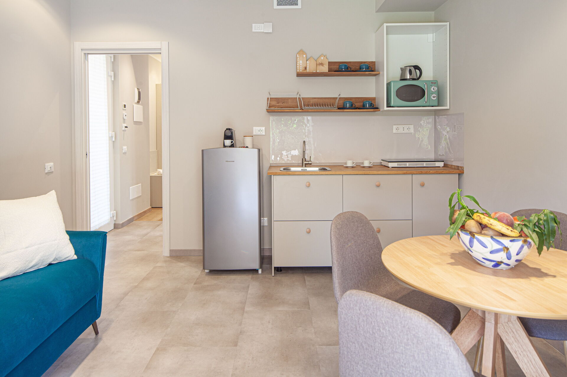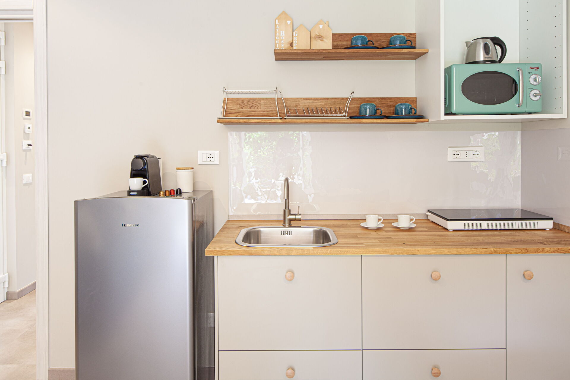 - Un séjour avec kitchenette équipée de plaques à induction, four combiné (micro-ondes + grill), évier, réfrigérateur avec compartiment congélateur, cafetière Nespresso, cafetière américaine, Moka italien, bouilloire électrique. Table à manger avec 4 chaises.